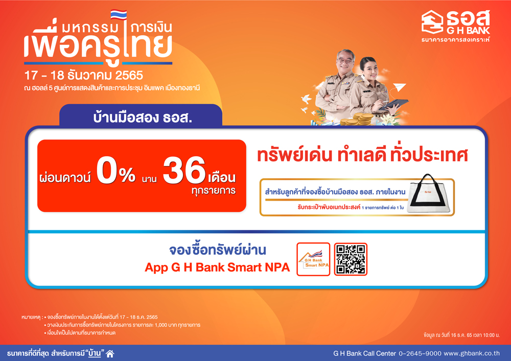 บ้านมือสอง ธอส. จากทั่วประเทศ จำหน่ายพร้อมส่วนลดสุดพิเศษ และสามารถผ่อนดาวน์ 0% ระยะเวลานานถึง 36 เดือนทุกรายการทรัพย์ สามารถจองซื้อทรัพย์ออนไลน์ภายในและวางเงิน 1,000 บาท ในวันทำสัญญาจะซื้อจะขาย (เงื่อนไขเป็นไปตามที่ธนาคารกำหนด) พิเศษ!! รับฟรีของสมนาคุณสำหรับลูกค้าที่จองซื้อบ้านมือสอง ธอส. ภายในงาน สามารถจองสิทธิ์ซื้อและเลือกดูทรัพย์ได้ที่ Application : G H Bank Smart NPA