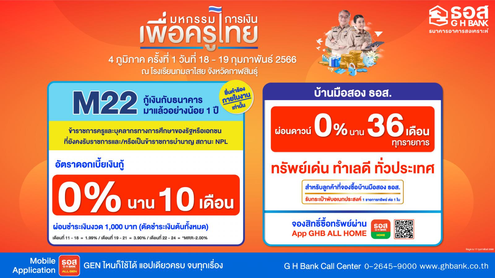 ทั้งนี้ การจัดงานมหกรรมการเงินเพื่อครูไทย 4 ภูมิภาค จะจัดขึ้นทั้งหมด 5 ครั้ง ประกอบด้วย ครั้งที่ 1 ภาคตะวันออกเฉียงเหนือ : วันที่ 18-19 กุมภาพันธ์ 2566 ณ โรงเรียนกมลาไสย จ.กาฬสินธุ์ ครอบคลุมการให้ความช่วยเหลือข้าราชการครูใน จ.กาฬสินธุ์ ขอนแก่น มหาสารคามและ ร้อยเอ็ด, ครั้งที่ 2 ภาคตะวันออกเฉียงเหนือ : วันที่ 4-5 มีนาคม 2566 ณ จ.อุดรธานี ครอบคลุมการให้ความช่วยเหลือข้าราชการครูใน จ.อุดรธานี บึงกาฬ เลย หนองคาย และ หนองบัวลำภู, ครั้งที่ 3 ภาคตะวันออก : วันที่ 11-12 มีนาคม 2566 ณ จ.สระแก้ว ครอบคลุมการให้ความช่วยเหลือข้าราชการครูใน จ.สระแก้ว ปราจีนบุรี และนครนายก, ครั้งที่ 4 ภาคเหนือ : วันที่ 18-19 มีนาคม 2566 ณ จ.พิษณุโลกครอบคลุมการให้ความช่วยเหลือข้าราชการครูใน จ.พิษณุโลก ตาก สุโขทัย เพชรบูรณ์ และอุตรดิตถ์ และ ครั้งที่ 5 ภาคใต้ : วันที่ 25-26 มีนาคม 2566 จัดที่ จ.สุราษฏร์ธานี ครอบคลุมการให้ความช่วยเหลือข้าราชการครูใน จ.สุราษฏร์ธานี นครศรีธรรมราช ชุมพร กระบี่ พังงา ระนอง และ พัทลุง สอบถามรายละเอียดเพิ่มเติมได้ที่ ธอส.ทุกสาขาทั่วประเทศ G H Bank Call Center โทร 0-2645-9000 หรือ Facebook Fanpage ธนาคารอาคารสงเคราะห์ และติดตามข่าวสารของธนาคารได้ที่ Mobile Application : GHB ALL, GHB ALL GEN และ www.ghbank.co.th
