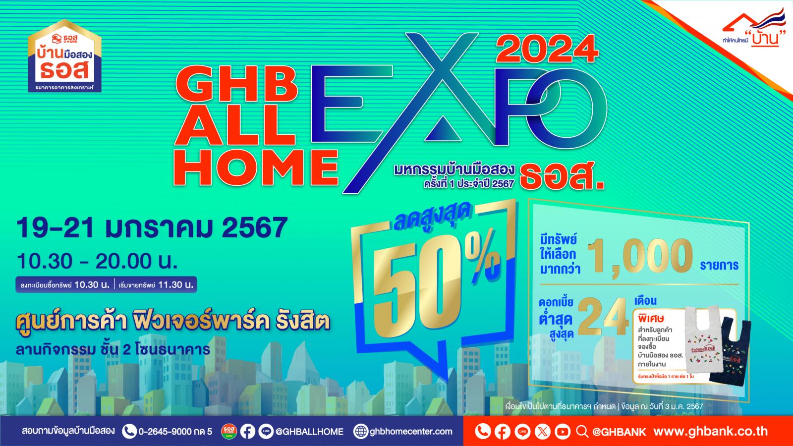 ธนาคารอาคารสงเคราะห์ (ธอส.) สถาบันการเงินของรัฐ ที่มีพันธกิจ “ทำให้คนไทยมีบ้าน” เอาใจคนอยากมีบ้าน จัดงาน มหกรรมบ้านมือสอง ธอส. : GHB ALL HOME EXPO 2024 @ฟิวเจอร์พาร์ค รังสิต ระหว่างวันที่ 19-21 มกราคม 2567 ณ ศูนย์การค้าฟิวเจอร์พาร์ค รังสิต นำบ้านมือสองคุณภาพดี ทำเลเด่น และราคาคุ้มค่า ที่ตั้งอยู่ในกรุงเทพฯ และปริมณฑล มาจำหน่าย กว่า 924 รายการ และทรัพย์ในภูมิภาคอีก 500 รายการ ทั้งประเภทบ้านเดี่ยว บ้านแฝด ทาวน์เฮ้าส์ และห้องชุด (คอนโดมิเนียม) พร้อมส่วนลดสูงสุด 50% จากราคาในปัจจุบัน โดยทรัพย์ที่มีราคาต่ำสุด คือ ทรัพย์ประเภทคอนโดมิเนียม ขนาดเนื้อที่ 26.25 ตารางเมตร ในโครงการปลาทอง 111 อ.เมืองปทุมธานี จ.ปทุมธานี มีราคาเพียง 45,000 บาท เท่านั้น!! พิเศษ!! ผู้ที่ลงทะเบียนจองซื้อทรัพย์ภายในงานมีโอกาสได้รับสินเชื่ออัตราดอกเบี้ยต่ำสุด นานสูงสุด 24 เดือน และกระเป๋าหิ้วมือ 1 ราย ต่อ 1 ใบ (เงื่อนไขเป็นไปตามที่ธนาคารกำหนด) สอบถามข้อมูลเพิ่มเติมได้ที่ GH Bank Call Center โทร. 0-2645-9000 กด 5 หรือ Facebook Fanpage บ้านมือสอง ธอส. หรือ ดูข้อมูลบ้านมือสอง ธอส. ได้ที่ www.ghbhomecenter.com, Mobile Application : GHB ALL HOME และ Line Official Account : @ghbnpa