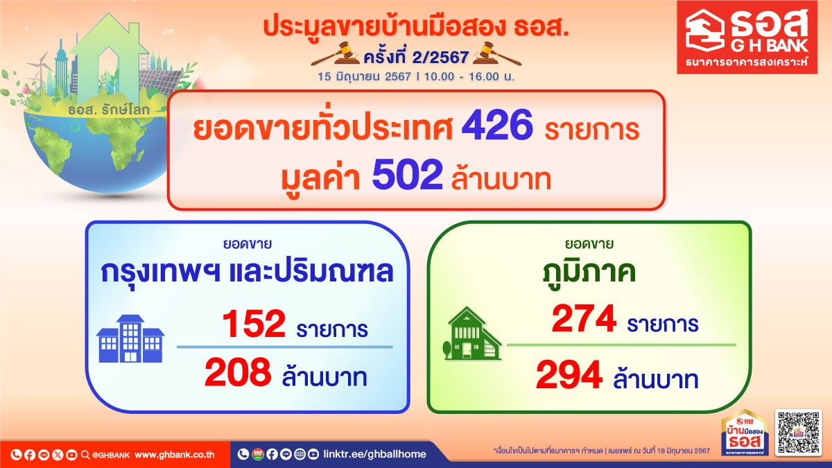 ได้จำนวนทั้งสิ้น 426 รายการ คิดเป็นมูลค่าที่จำหน่ายได้รวม 502 ล้านบาท แบ่งเป็นทรัพย์ที่ตั้งอยู่ในพื้นที่กรุงเทพฯ และปริมณฑล จำนวน 152 รายการ มูลค่ารวม 208 ล้านบาท และทรัพย์ในส่วนภูมิภาค จำนวน 274 รายการ