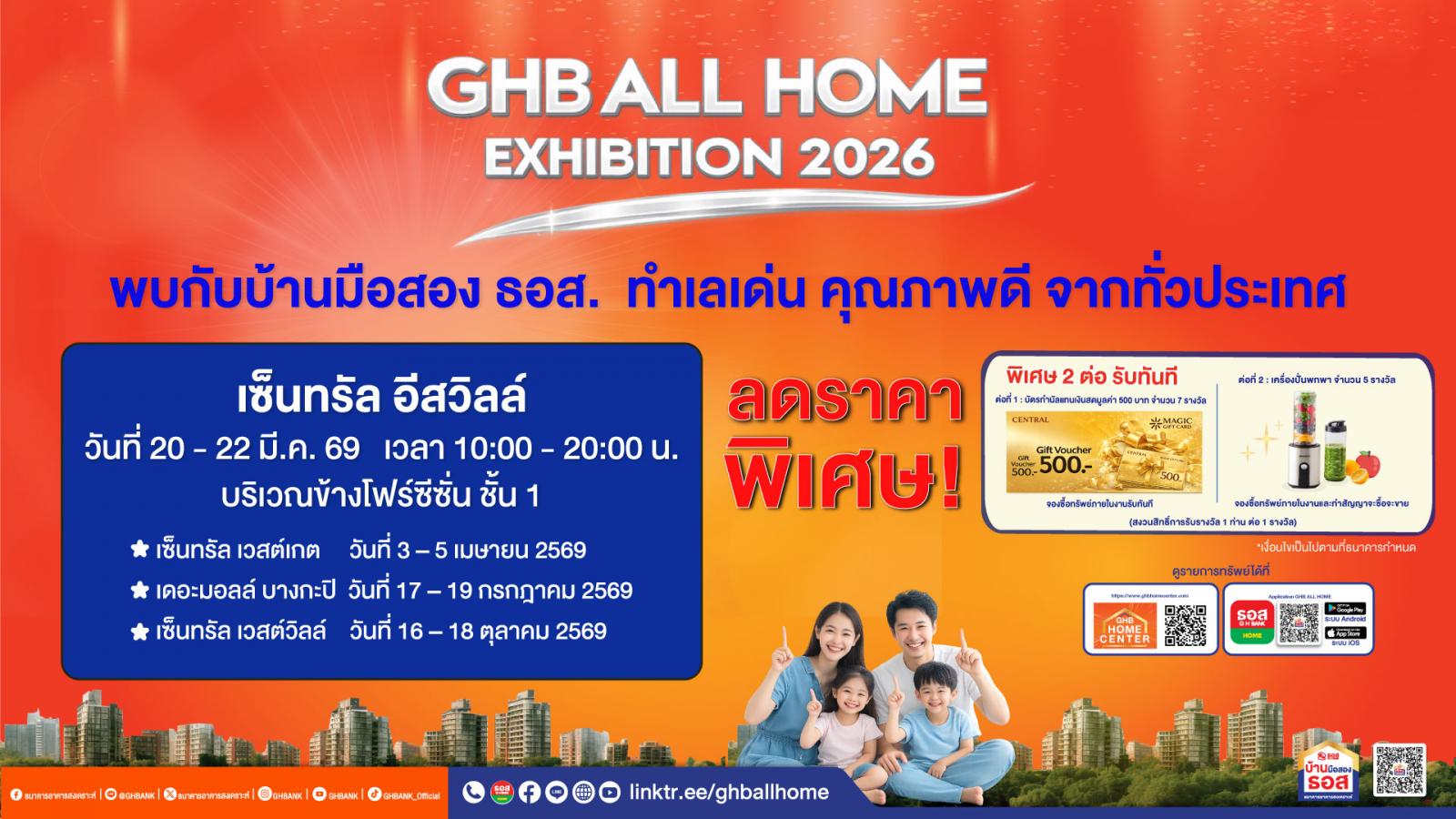ธนาคารอาคารสงเคราะห์ (ธอส.) เดินหน้ากระตุ้นตลาดอสังหาริมทรัพย์ปี 2569 จัดโรดโชว์มหกรรมบ้านมือสอง “GHB ALL HOME EXHIBITION 2026” 4 ทำเลทอง เข้าถึงประชาชนทุกพื้นที่ พร้อมนำเสนอทรัพย์เด่นราคาคุ้มค่า และโปรโมชันพิเศษ เพิ่มโอกาสให้คนไทยมีบ้านเป็นของตนเอง รองรับทั้งผู้ต้องการที่อยู่อาศัยและลงทุน โดยภายในงานนอกจากจะมีบ้านและคอนโดมิเนียมทำเลดี ราคาพิเศษแล้ว ยังมีผลิตภัณฑ์สินเชื่อดอกเบี้ยพิเศษ 0% ต่อปี คงที่ 2 ปีแรก และของสมนาคุณ สำหรับผู้ที่จองซื้อทรัพย์ภายในงาน นอกจากนี้ยังมีบริการให้คำปรึกษาสินเชื่อ เงินฝาก และสลากออมทรัพย์ แบบ One-Stop Service ครบจบในที่เดียวอีกด้วย ทั้งนี้ งานครั้งแรกจะจัดขึ้นที่เซ็นทรัล อีสต์วิลล์ ระหว่างวันที่ 20 – 22 มีนาคม 2569 เวลา 10.00 – 20.00 น.ครั้งที่ 2 เซ็นทรัล เวสต์เกต ระหว่างวันที่ 3 – 5 เมษายน 2569 ครั้งที่ 3 เดอะมอลล์ บางกะปิ ระหว่างวันที่ 17 – 19 กรกฎาคม 2569 และครั้งที่ 4 เซ็นทรัล เวสต์วิลล์ ระหว่างวันที่ 16 – 18 ตุลาคม 2569 สอบถามข้อมูลเพิ่มเติมได้ที่ GHBank Call Center โทร.0-2645-9000 กด 5 หรือ Facebook Fanpage บ้านมือสอง ธอส. หรือดูข้อมูลบ้านมือสอง ธอส. ได้ที่ www.ghbhomecenter.com Application : GHB ALL HOME และ Line Official Account : @GHBALLHOME