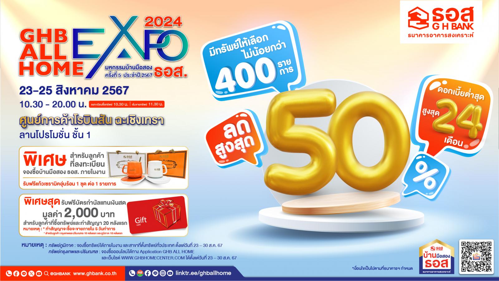 ธนาคารอาคารสงเคราะห์ (ธอส.) เอาใจคนอยากมีบ้าน จัดงาน มหกรรมบ้านมือสอง ธอส. : GHB ALL HOME EXPO 2024 ครั้งที่ 5 @โรบินสัน ฉะเชิงเทรา ระหว่างวันที่ 23 - 25 สิงหาคม 2567 ณ ศูนย์การค้าโรบินสัน ฉะเชิงเทรา โดยนำบ้านมือสองคุณภาพดี ทำเลเด่น และราคาคุ้มค่า ที่ตั้งอยู่ในกรุงเทพฯ และปริมณฑล รวมทั้งภูมิภาคมาจำหน่ายไม่น้อยกว่า 400 รายการ ทั้งประเภทบ้านเดี่ยว บ้านแฝด ทาวน์เฮ้าส์ และห้องชุด (คอนโดมิเนียม) พร้อมส่วนลดสูงสุด 50% จากราคาในปัจจุบัน โดยมีทรัพย์ที่น่าสนใจ อาทิ ทรัพย์ประเภทบ้านเดี่ยว ขนาดเนื้อที่ 59.20 ตารางวา ในโครงการหมู่บ้านแสงทอง ตำบลหัวสำโรง อำเภอแปลงยาว จังหวัดฉะเชิงเทรา มีราคาจำหน่ายอยู่ที่ 2.31 ล้านบาท พิเศษต่อที่ 1!! ผู้ที่จองซื้อทรัพย์ภายในงานมีโอกาสได้รับสินเชื่ออัตราดอกเบี้ยต่ำสุด นานสูงสุด 24 เดือน พร้อมรับฟรีแก้วเซรามิคอุ่นร้อน 1 ชุด ต่อ 1 รายการ พิเศษต่อที่ 2!! รับบัตรกํานัลแทนเงินสดมูลค่า 2,000 บาท สำหรับ 20 ท่านแรก โดยแบ่งเป็นทรัพย์ในเขตกรุงเทพและปริมณฑลจำนวน 10 รางวัล และทรัพย์ในส่วนภูมิภาคจำนวน 10 รางวัล (เงื่อนไขเป็นไปตามที่ธนาคารกำหนด) โดยสอบถามข้อมูลเพิ่มเติมได้ที่ G H Bank Call Center โทร. 0-2645-9000 กด 5 หรือ Facebook Fanpage บ้านมือสอง ธอส. หรือ ดูข้อมูลบ้านมือสอง ธอส. ได้ที่ www.ghbhomecenter.com, Mobile Application : GHB ALL HOME และ Line Official Account : @GHBALLHOME
