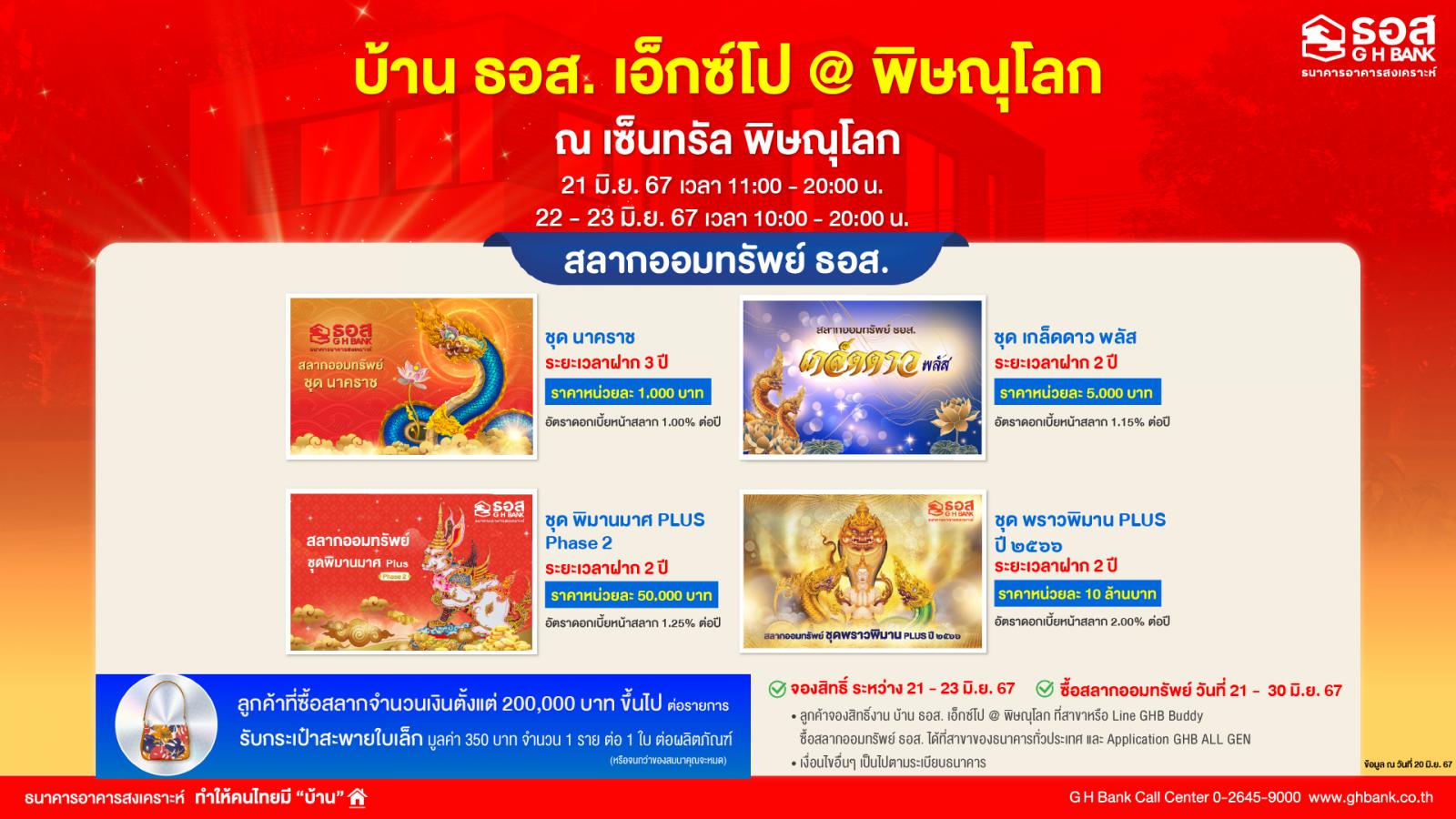 (1) สินเชื่อบ้านอัตราดอกเบี้ยพิเศษ อัตราดอกเบี้ยเดือนที่ 1 - 6 คงที่เท่ากับ 1.99% ต่อปี, เดือนที่ 7 - 36 คงที่เท่ากับ 3.19% ต่อปี (อัตราดอกเบี้ยเฉลี่ย 3 ปีแรกเท่ากับ 2.99% เท่านั้น) และปีที่ 4 จนถึงตลอดอายุสัญญา กรณีลูกค้าสวัสดิการ เท่ากับ MRR-1.00% ต่อปี, ลูกค้ารายย่อย เท่ากับ MRR-0.50% ต่อปี และการกู้ชำระหนี้เกี่ยวกับที่อยู่อาศัย เท่ากับ MRR (อัตราดอกเบี้ย MRR ธอส. ในปัจจุบัน เท่ากับ 6.545% ต่อปี) ผ่อนชำระนานสูงสุดถึง 40 ปี ให้กู้ครอบคลุมทุกวัตถุประสงค์หลัก อาทิ ซื้อบ้าน/คอนโดมิเนียม ปลูกสร้าง ต่อเติม ซ่อมแซม รีไฟแนนซ์ และชำระหนี้เกี่ยวกับที่อยู่อาศัย (หลักประกันในการยื่นกู้ต้องอยู่ในเขตพื้นที่จังหวัดพิษณุโลก อุตรดิตถ์ สุโขทัย พิจิตร เพชรบูรณ์ นครสวรรค์ กำแพงเพชร ชัยนาท อุทัยธานี และลพบุรี เท่านั้น) โดยสามารถจองสิทธิ์ผ่าน Line GHB Buddy ยื่นคำขอกู้ได้ตั้งแต่วันที่ 21 มิถุนายน – 30 กันยายน 2567 และทำนิติกรรมภายในวันที่ 31 ตุลาคม 2567 พิเศษ! ฟรีค่าประเมินราคาหลักประกัน และรับ Gift Voucher จาก บิ๊กซี ซูเปอร์เซ็นเตอร์ มูลค่า 1,000 บาท (1 ใบต่อ 1 ราย) และพิเศษแบบสุด ๆ สำหรับลูกค้าภายในงานเท่านั้น!! จะได้พบกับช่วง Golden Minute อัตราดอกเบี้ยปีแรกเพียง 1.99% ต่อปี เปิดจองสิทธิ์ผ่าน Mobile Application : GHB ALL GEN ในวันอาทิตย์ที่ 23 มิถุนายน 2567 ระหว่างเวลา 15.00-15.15 น. จองก่อนได้ก่อน กรอบวงเงินจำกัดและเงื่อนไขตามที่ธนาคารกำหนด พิเศษ! สำหรับลูกค้าที่มีวงเงินทำนิติกรรมสูงสุด 3 อันดับแรก รับเครื่องฟอกอากาศ 1 เครื่อง (อันดับละ 1 เครื่อง) อีกด้วย