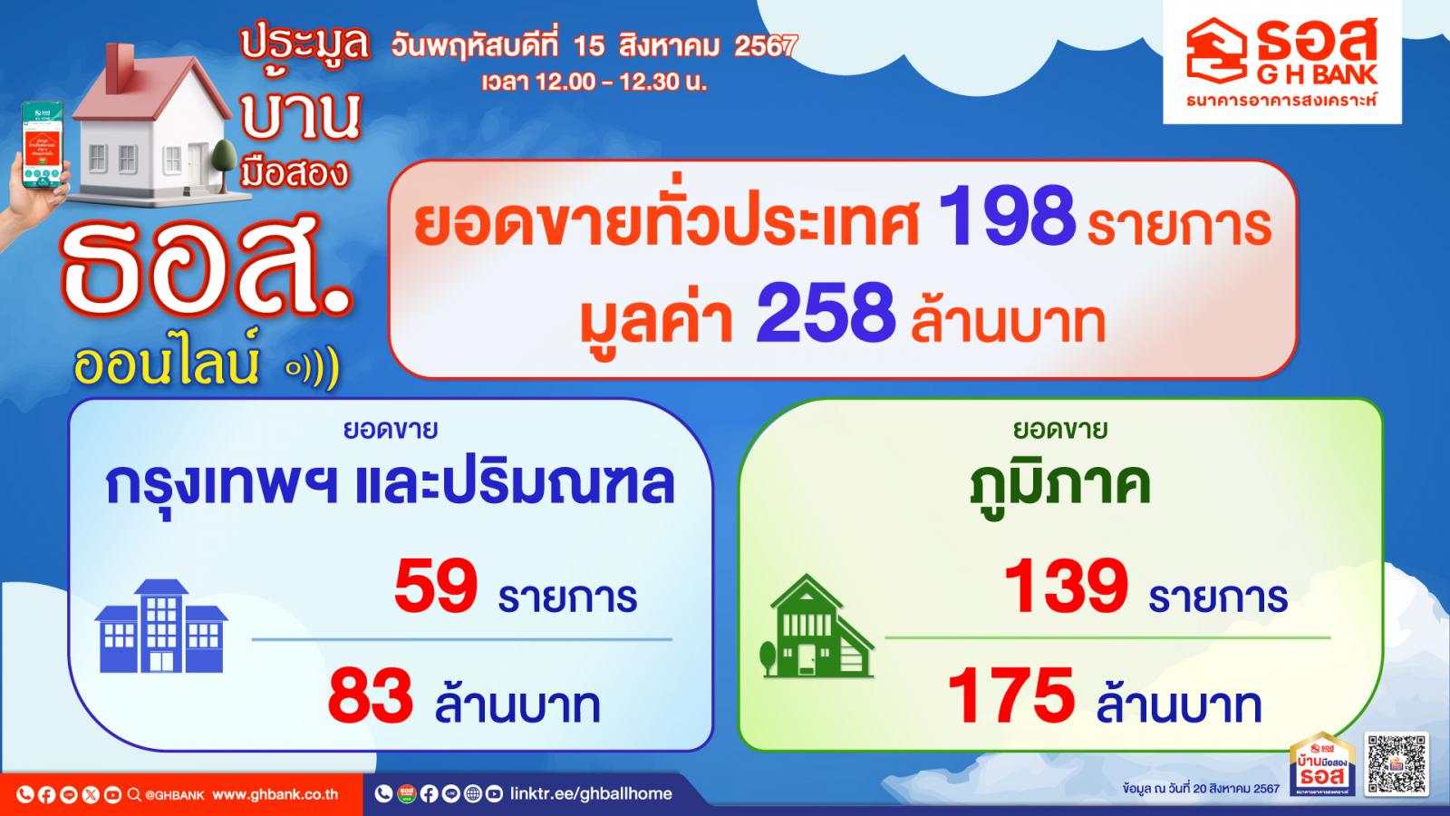 ธนาคารอาคารสงเคราะห์ (ธอส.) เปิดเผยผลการจัดงาน “ประมูลบ้านมือสองออนไลน์ : GHB’S NPA Online Auction 2024” ประจำเดือนสิงหาคม 2567 ซึ่งจัดขึ้นพร้อมกันทั่วประเทศ ผ่าน Application : GHB ALL HOME เมื่อวันพฤหัสบดีที่ 15 สิงหาคม 2567 และเนื่องจากมีประชาชนให้ความสนใจจำนวนมาก ทำให้ธนาคารต้องขยายระยะเวลาการประมูลออกไป ระหว่างเวลา 12.00 - 14.00 น. โดยสามารถจำหน่ายบ้านมือสองได้จำนวน 198 รายการ คิดเป็นมูลค่า 258 ล้านบาท แบ่งเป็น ทรัพย์ที่ตั้งอยู่ในพื้นที่กรุงเทพฯ และปริมณฑล จำนวน 59 รายการ มูลค่ารวม 83 ล้านบาท และในส่วนภูมิภาค 139 รายการ มูลค่ารวม 175 ล้านบาท โดยรายการทรัพย์ที่ประมูลได้ในราคาต่ำที่สุดเพียง 265,000 บาท ได้แก่ ทรัพย์ประเภทบ้านเดี่ยว ขนาดเนื้อที่ 40 ตารางวา ในพื้นที่อำเภอกันทรวิชัย จังหวัดมหาสารคาม และทรัพย์ที่ประมูลในราคาสูงสุด ได้แก่ ทรัพย์ประเภทบ้านเดี่ยว ขนาดเนื้อที่ 50.3 ตารางวา ในพื้นที่อำเภอบางกรวย จังหวัด กรุงเทพ ฯ โดยประมูลได้ในราคา 6,460,000 บาท พิเศษ! ผู้ชนะการประมูลหากทำสัญญาจะซื้อจะขายภายในวันที่ 26 สิงหาคม 2567 สามารถใช้ “ผลิตภัณฑ์สินเชื่อสำหรับซื้อทรัพย์ NPA พร้อมขายของธนาคาร” (เงื่อนไขเป็นไปตามหลักเกณฑ์ที่ธนาคารกำหนด) และหากทำนิติกรรมและโอนกรรมสิทธิ์ภายในวันที่ 15 ตุลาคม 2567 จะได้รับส่วนลด On Top เพิ่มอีก 15%* จากราคาที่ปิดประมูล โดยสอบถามข้อมูลเพิ่มเติมได้ที่ G H Bank Call Center โทร.0-2645-9000 กด 5 หรือ Facebook Fanpage ธนาคารอาคารสงเคราะห์ หรือดูข้อมูลบ้านมือสอง ธอส. ได้ที่ www.ghbhomecenter.com และ Mobile Application : GHB ALL HOME