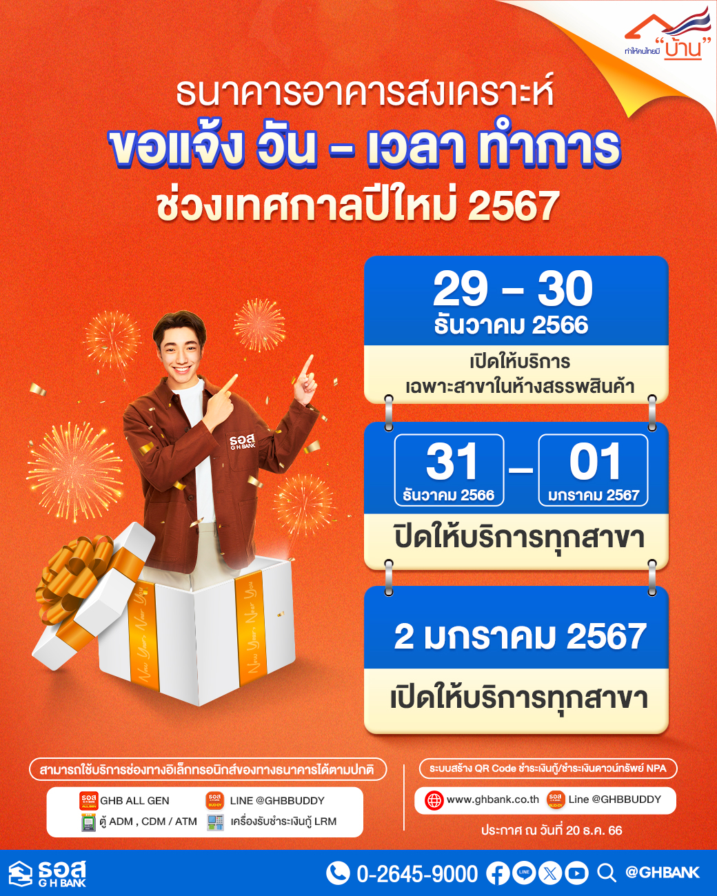 หน้าแรก หน้าแรก ศูนย์ข่าวสาร ข่าวประชาสัมพันธ์ ธนาคารอาคารสงเคราะห์ ขอแจ้งวัน - เวลา ทำการช่วงเทศกาลปีใหม่ 2567 ศูนย์ข่าวสาร คัดลอกลิ้งค์เก็บไว้ที่คลิปบอร์ดแล้ว ธนาคารอาคารสงเคราะห์ ขอแจ้งวัน - เวลา ทำการช่วงเทศกาลปีใหม่ 2567 ข่าวประชาสัมพันธ์ 20 ธันวาคม 2566 คัดลอกลิ้งค์เก็บไว้ที่คลิปบอร์ดแล้ว