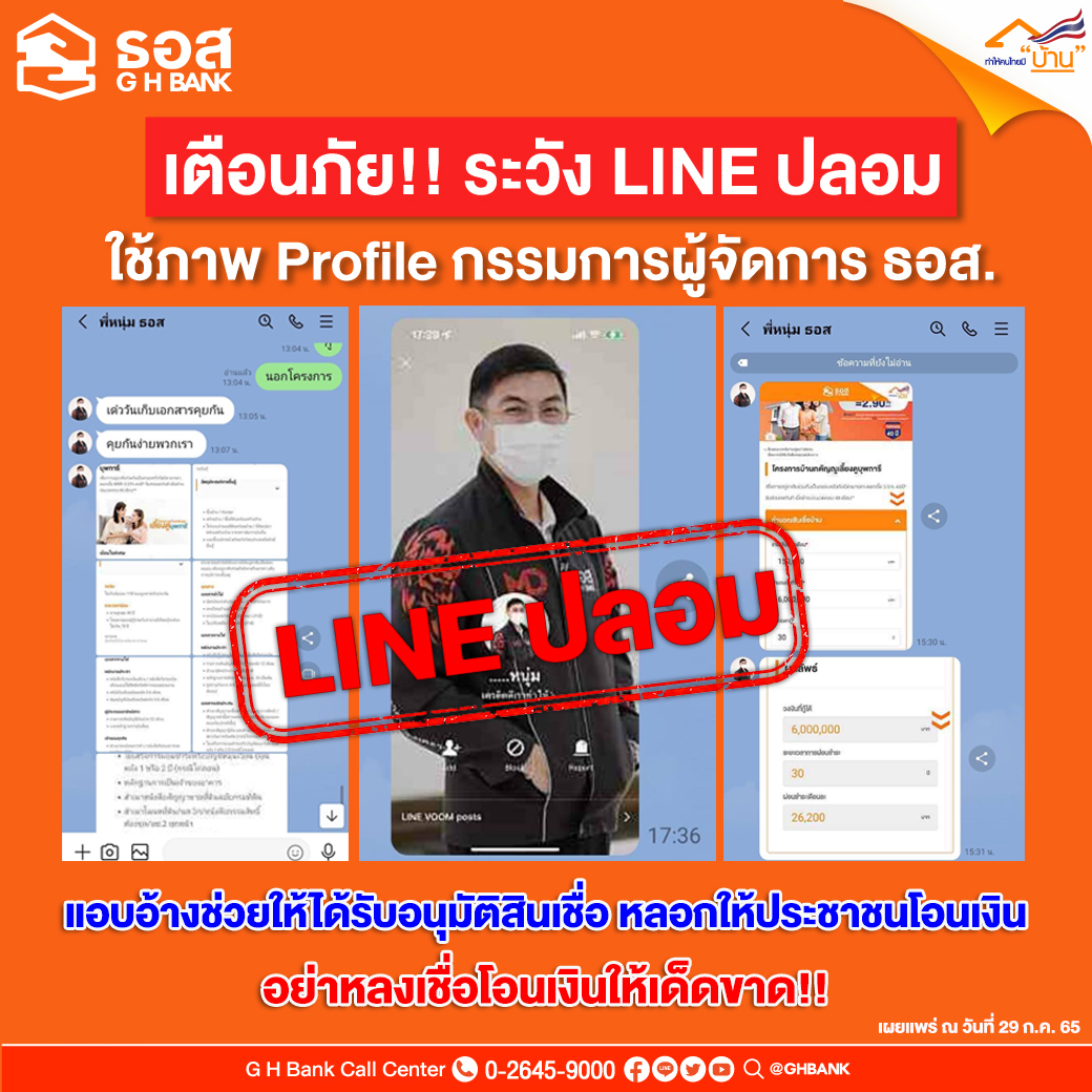 ธนาคารอาคารสงเคราะห์ (ธอส.) ขอแจ้งเตือนภัย กรณีมีมิจฉาชีพสร้าง Account LINE ปลอม โดยใช้รูปภาพของนายฉัตรชัย ศิริไล กรรมการผู้จัดการ ธนาคารอาคารสงเคราะห์ เป็นรูปภาพ Profile และใช้ชื่อ Account ว่า “หนุ่ม” แอบอ้างเป็นผู้จัดการภาคตะวันออกของ ธอส. และหลอกลวงว่าจะสามารถช่วยให้ประชาชนได้รับอนุมัติสินเชื่อจากธนาคารได้แต่ต้องโอนเงินให้มิจฉาชีพก่อน โดยมีผู้เสียหาย 1 ราย หลงเชื่อและโอนเงินให้มิจฉาชีพ โดยธนาคารอาคารสงเคราะห์ขอยืนยันว่า ธนาคารและกรรมการผู้จัดการ ไม่มีส่วนเกี่ยวข้องกับ Account LINE ปลอมดังกล่าว รวมถึง Account Line อื่น ๆ ที่อาจใช้รูปภาพและกระทำในลักษณะเดียวกัน เพื่อหลอกลวงเอาเงินจากประชาชน ซึ่ง ธอส.อยู่ระหว่างดำเนินการทางกฎหมายกับกลุ่มมิจฉาชีพที่แอบอ้างแล้ว และธนาคารขอเตือนให้ผู้ที่ได้รับข้อความลักษณะนี้ อย่าหลงเชื่อกลโกงของมิจฉาชีพหรือโอนเงินให้อย่างเด็ดขาด สอบถามรายละเอียด หรือ ติดต่อข้อมูลข่าวสารของธนาคารเพิ่มเติมได้ที่ www.ghbank.co.th หรือ G H Bank Call Center โทร 0-2645-9000 และ Facebook Fanpage ธนาคารอาคารสงเคราะห์
