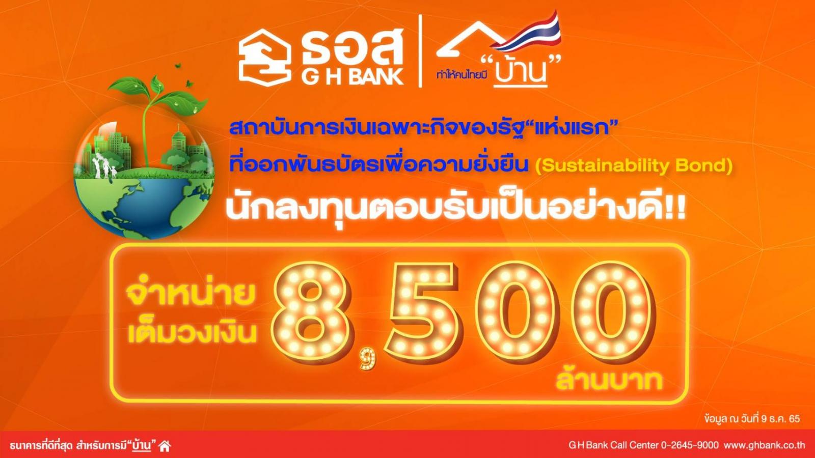 นายฉัตรชัย ศิริไล กรรมการผู้จัดการ ธนาคารอาคารสงเคราะห์ (ธอส.) เปิดเผยว่า การออกพันธบัตรเพื่อความยั่งยืน (Sustainability Bond) ครั้งแรกของธนาคาร ประสบความสำเร็จ โดยได้รับการตอบรับเป็นอย่างดีจากนักลงทุน โดยมียอดจองเกินเป้าไปกว่า 1.7 เท่า เสนอขายให้กับผู้ลงทุนสถาบัน (Institutional Investors ) มูลค่าเสนอขายรวม 8,500 ล้านบาท เพิ่มขึ้นจากเดิมที่ธนาคารตั้งเป้าหมายในการเสนอขายพันธบัตรที่ 5,000 ล้านบาท เนื่องจากได้รับความสนใจจากนักลงทุนอย่างมากสะท้อนให้เห็นถึงความเชื่อมั่นของนักลงทุนที่มีต่อธนาคาร อีกทั้งยังสะท้อนให้เห็นถึงการให้ความสำคัญต่อการดำเนินธุรกิจอย่างยั่งยืนของนักลงทุน โดยความสำเร็จในการออกพันธบัตรเพื่อความยั่งยืน (Sustainability Bond) ของ ธอส. ในครั้งนี้เป็นการสนับสนุนการพัฒนาตลาดทุนด้านความยั่งยืนของประเทศ ควบคู่ไปกับการสานต่อพันธกิจทำให้คนไทยมีบ้านของธนาคาร และส่งเสริมการขับเคลื่อนสู่การเป็น Sustainable Bank ที่มีเป้าหมายดูแลโลกและพัฒนาสังคมที่ยั่งยืนไปพร้อมกัน ทั้งนี้ ธนาคารจะนำเงินที่ได้ไปใช้สำหรับ โครงการสินเชื่อเพื่อที่อยู่อาศัยที่เกี่ยวข้องกับการพัฒนาสังคมช่วยเหลือให้ผู้ที่มีรายได้น้อยและปานกลางได้มีที่อยู่อาศัยเป็นของตนเอง และการอนุรักษ์สิ่งแวดล้อมโดยสนับสนุนให้ประชาชนมีที่อยู่อาศัยที่ประหยัดพลังงาน