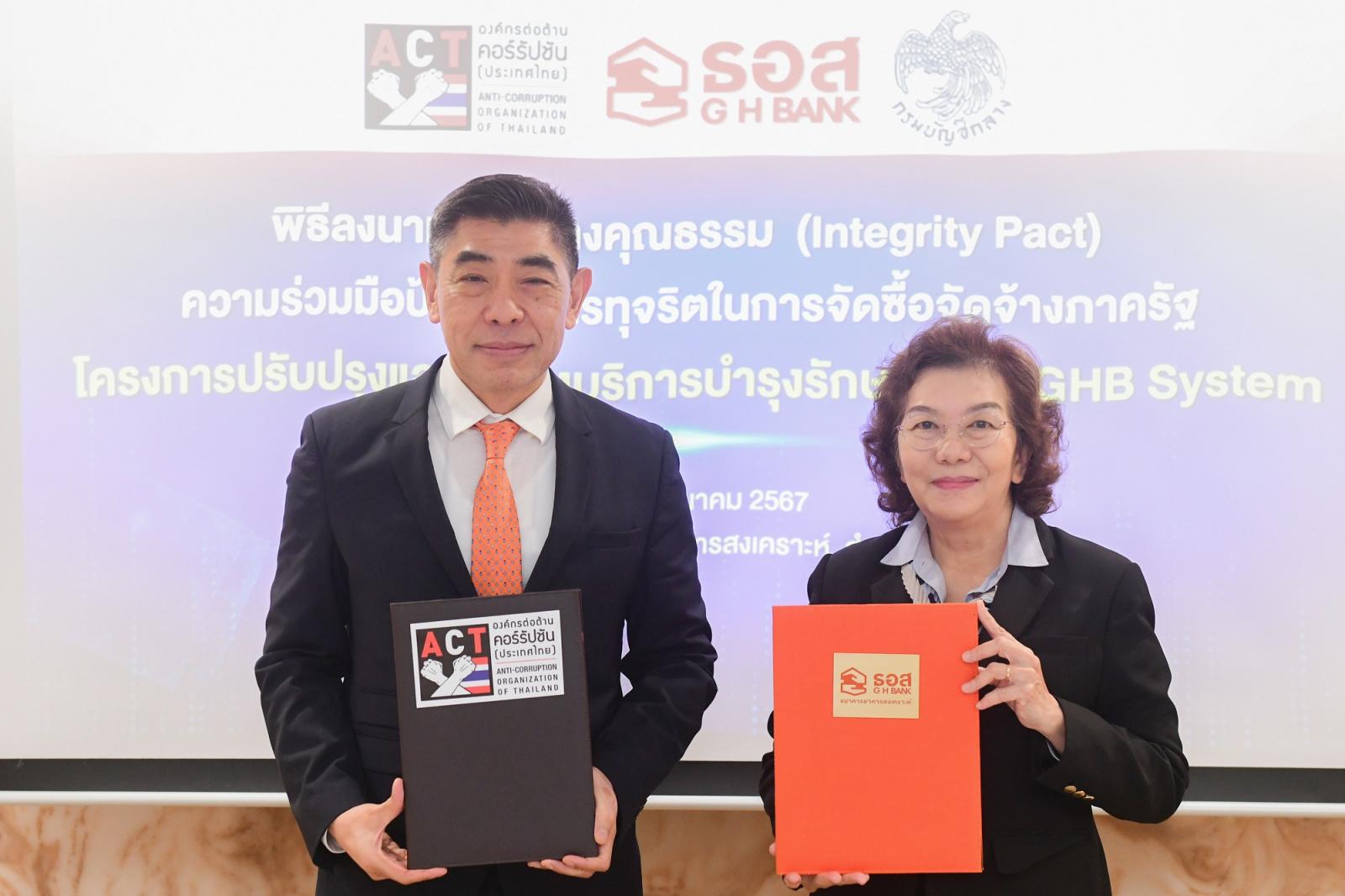 นายกมลภพ วีระพละ กรรมการผู้จัดการ ธนาคารอาคารสงเคราะห์ (ธอส.) ลงนามข้อตกลงคุณธรรม (Integrity Pact) “โครงการปรับปรุงและว่าจ้างบริการบำรุงรักษาระบบ GHB System” ร่วมกับ คณะผู้สังเกตการณ์ จากคณะกรรมการความร่วมมือและป้องกันการทุจริต กรมบัญชีกลาง และองค์กรต่อต้านคอร์รัปชัน (ประเทศไทย) เพื่อเพิ่มประสิทธิภาพการใช้จ่ายงบประมาณให้เกิดประโยชน์สูงสุด ยกระดับความโปร่งใสของโครงการจัดซื้อจัดจ้างภาครัฐ และสร้างความเชื่อมั่นให้กับทุกภาคส่วนที่เกี่ยวข้องกับการจัดหาตามโครงการดังกล่าว ซึ่งความร่วมมือในครั้งนี้ ดำเนินการตามนโยบายป้องกันและปราบปรามการทุจริต ที่สอดคล้องกับยุทธศาสตร์ชาติว่าด้วยการป้องกันและปราบปรามการทุจริต ของสำนักงานคณะกรรมการป้องกันและปราบปรามการทุจริตแห่งชาติ (ป.ป.ช.) และกรอบหลักการประเมินคุณธรรมและความโปร่งใสในการดำเนินงานของหน่วยงานภาครัฐ (ITA) ที่มีความโปร่งใส ซื่อสัตย์สุจริต พร้อมเปิดเผยข้อมูลข่าวสารของธนาคารและข้อมูลเกี่ยวกับการจัดซื้อจัดจ้างอย่างตรงไปตรงมา เพื่อให้ประชาชนสามารถเข้าถึงและตรวจสอบความถูกต้องได้ โดยผู้สังเกตการณ์จะเข้าร่วมสังเกตการณ์ในกระบวนการจัดซื้อจัดจ้างทุกขั้นตอนตลอดระยะเวลาของโครงการฯ เพื่อความโปร่งใสในการดำเนินโครงการฯ นอกจากนี้ยังเป็นการแสดงเจตจำนงร่วมกันของทุกฝ่ายที่จะปฏิบัติหน้าที่ด้วยความโปร่งใส และซื่อสัตย์สุจริต