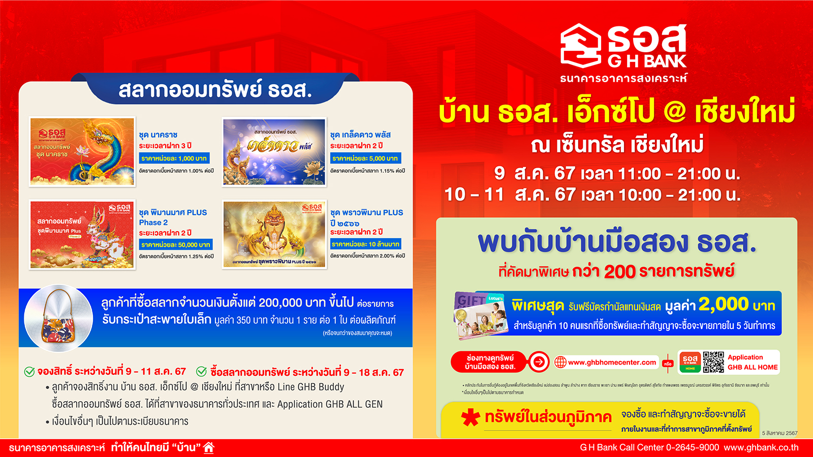 ทั้งนี้ ลูกค้าที่ใช้บริการผลิตภัณฑ์การเงินของ ธอส. ตามเงื่อนไขและระยะเวลาที่ธนาคารกำหนด จะได้รับของที่ระลึกฟรีอีกมากมาย โดยงานบ้าน ธอส. เอ็กซ์โป @เชียงใหม่ มีกำหนดจัดขึ้นระหว่างวันที่ 9 – 11 สิงหาคม 2567 ณ เซ็นทรัล เชียงใหม่ โดยสอบถามรายละเอียดเพิ่มเติมได้ที่ ธอส.ทุกสาขาทั่วประเทศ G H Bank Call Center โทร.0-2645-9000 หรือ Facebook Fanpage ธนาคารอาคารสงเคราะห์ และติดตามข่าวสารของธนาคารได้ที่ Application : GHB ALL GEN และ www.ghbank.co.th