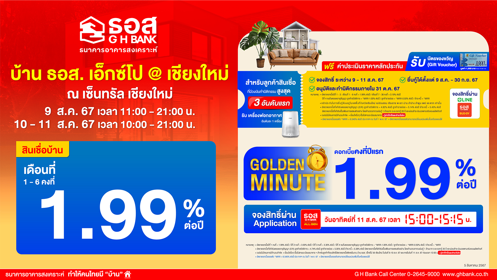 อัตราดอกเบี้ยปีแรกเพียง 1.99% ต่อปี เปิดจองสิทธิ์ผ่าน Mobile Application : GHB ALL GEN ในวันอาทิตย์ที่ 11 สิงหาคม 2567 ระหว่างเวลา 15.00-15.15 น. จองก่อนได้ก่อน โดยมีกรอบวงเงินจำกัดและเงื่อนไขตามที่ธนาคารกำหนด และสำหรับลูกค้าที่มีวงเงินทำนิติกรรมสูงสุด 3 อันดับแรก รับเครื่องฟอกอากาศ 1 เครื่อง (อันดับละ 1 เครื่อง) อีกด้วย