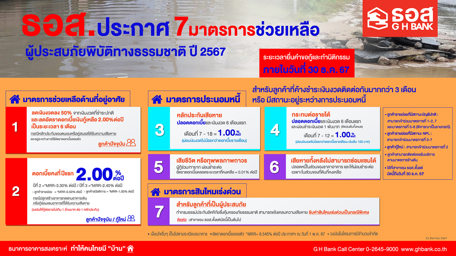 ภัยธรรมชาติตามความเสียหายจริงอีกไม่เกิน 30,000 บาท ต่อปี (รายละเอียดและเงื่อนไขเป็นไปตามกรมธรรม์)ทั้งนี้ ลูกค้าที่ประสงค์ขอรับบริการตามมาตรการที่ 1-6 สามารถติดต่อได้ที่สาขาของ ธอส. ตั้งแต่บัดนี้เป็นต้นไป ถึงวันที่ 30 ธันวาคม 2567 และมาตรการที่ 7 ติดต่อได้ที่สาขาของ ธอส. ตั้งแต่บัดนี้เป็นต้นไป โดยสอบถามรายละเอียดเพิ่มเติมได้ที่ ธอส. ทุกสาขาทั่วประเทศ หรือ G H Bank Call Center โทร 0-2645-9000 หรือ Facebook Fanpage ธนาคารอาคารสงเคราะห์ และ ติดตามข้อมูลข่าวสารได้ที่ Application : GHB ALL GEN และ www.ghbank.co.th