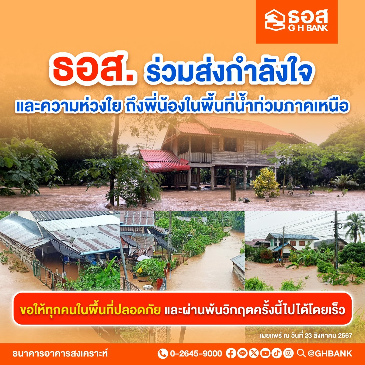 ธนาคารอาคารสงเคราะห์ (ธอส.) ช่วยเหลือพี่น้องชาวภาคเหนือ ที่ประสบปัญหาภัยพิบัติทางธรรมชาติ ฝนตกหนัก น้ำท่วมฉับพลัน น้ำป่าไหลหลาก ดินโคลนถล่ม ด้วยการจัดทำ “มาตรการช่วยเหลือผู้ประสบภัยพิบัติทางธรรมชาติ ปี 2567” โดยลูกค้าและประชาชนที่ประสบภัยสามารถติดต่อสาขาธนาคารทั่วประเทศ เพื่อขอรับความช่วยเหลือได้ตั้งแต่วันนี้ถึงวันที่ 30 ธันวาคม 2567