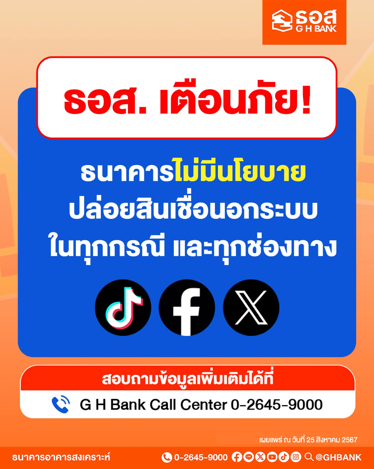 ธนาคารอาคารสงเคราะห์ (ธอส.) ขอแจ้งเตือนภัยกรณีมีกลุ่มมิจฉาชีพแอบอ้างใช้บัญชีปลอมและตัดต่อคลิปวิดีโอประชาสัมพันธ์การขอสินเชื่อของธนาคาร เพื่อใช้ในการโฆษณาเงินกู้นอกระบบ บนแพลตฟอร์มออนไลน์ต่าง ๆ โดย ธอส. ขอยืนยันว่า ไม่มีนโยบายในการปล่อยสินเชื่อนอกระบบ ดังนั้น จึงไม่มีส่วนเกี่ยวข้องกับการดำเนินการทั้งหมดนี้ อย่างไรก็ตาม ธนาคารอยู่ระหว่างดำเนินการทางกฎหมายกับกลุ่มมิจฉาชีพที่ตัดต่อคลิปวิดีโอดังกล่าว โดยธนาคารขอเตือนไปยังผู้ที่พบเห็นคลิปวิดีโอนี้ อย่าหลงเชื่อกลโกงหรือดำเนินการตามที่มิจฉาชีพแจ้งอย่างเด็ดขาด และขอความร่วมมือไม่ส่ง หรือแชร์ข้อมูลดังกล่าวต่อในช่องทางสื่อสังคมออนไลน์ ทั้งนี้ เพื่อให้ประชาชนได้รับข้อมูลข่าวสารที่ถูกต้องของธนาคารอาคารสงเคราะห์ สามารถติดตามได้ที่ www.ghbank.co.thหรือ G H Bank Call Center โทร 0-2645-9000 และ Facebook Fanpage ธนาคารอาคารสงเคราะห์
