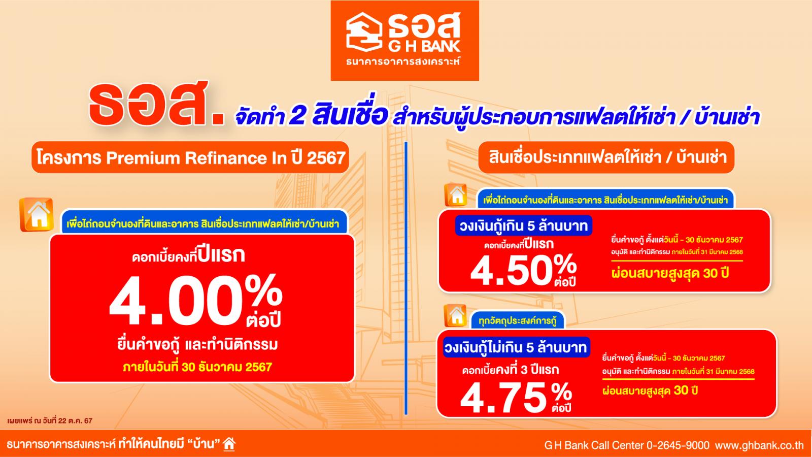 (1) โครงการ Premium Refinance In ปี 2567 เพื่อไถ่ถอนจำนองที่ดินและอาคาร สินเชื่อประเภทแฟลตให้เช่า / บ้านเช่า : สำหรับผู้ประกอบการที่ต้องการไถ่ถอนจำนองที่ดินและอาคารแฟลตให้เช่า / บ้านเช่า รวมถึงเพื่อซื้ออุปกรณ์หรือสิ่งอำนวยความสะดวกที่เกี่ยวเนื่องเพื่อประโยชน์ในการอยู่อาศัย อัตราดอกเบี้ย ปีที่ 1 คงที่ เท่ากับ 4.00% ต่อปี, ปีที่ 2 คงที่ เท่ากับ 4.50% ต่อปี, ปีที่ 3 คงที่ เท่ากับ 5.00% ต่อปี (อัตราดอกเบี้ยเฉลี่ย 3 ปีแรกเพียง 4.50% ต่อปี) ปีที่ 4 – 5 เท่ากับ MLR-1.00% ต่อปี (5.50% ต่อปี) และปีที่ 6 จนถึงตลอดอายุสัญญา เท่ากับ MLR (อัตราดอกเบี้ย MLR ของ ธอส. ในปัจจุบัน เท่ากับ 6.50% ต่อปี) ระยะเวลาการกู้นานสูงสุด 30 ปี พิเศษ! ยกเว้นค่าธรรมเนียมการยื่นกู้ และค่าประเมินหลักประกัน ผู้ที่สนใจสามารถยื่นคำขอกู้ได้ตั้งแต่วันนี้เป็นต้นไป และทำนิติกรรมถึงวันที่ 30 ธันวาคม 2567 หรือก่อนระยะเวลาดังกล่าว หากธนาคารให้สินเชื่อเต็มกรอบวงเงินโครงการแล้ว (กู้เท่าที่จำเป็นและชำระคืนไหว)