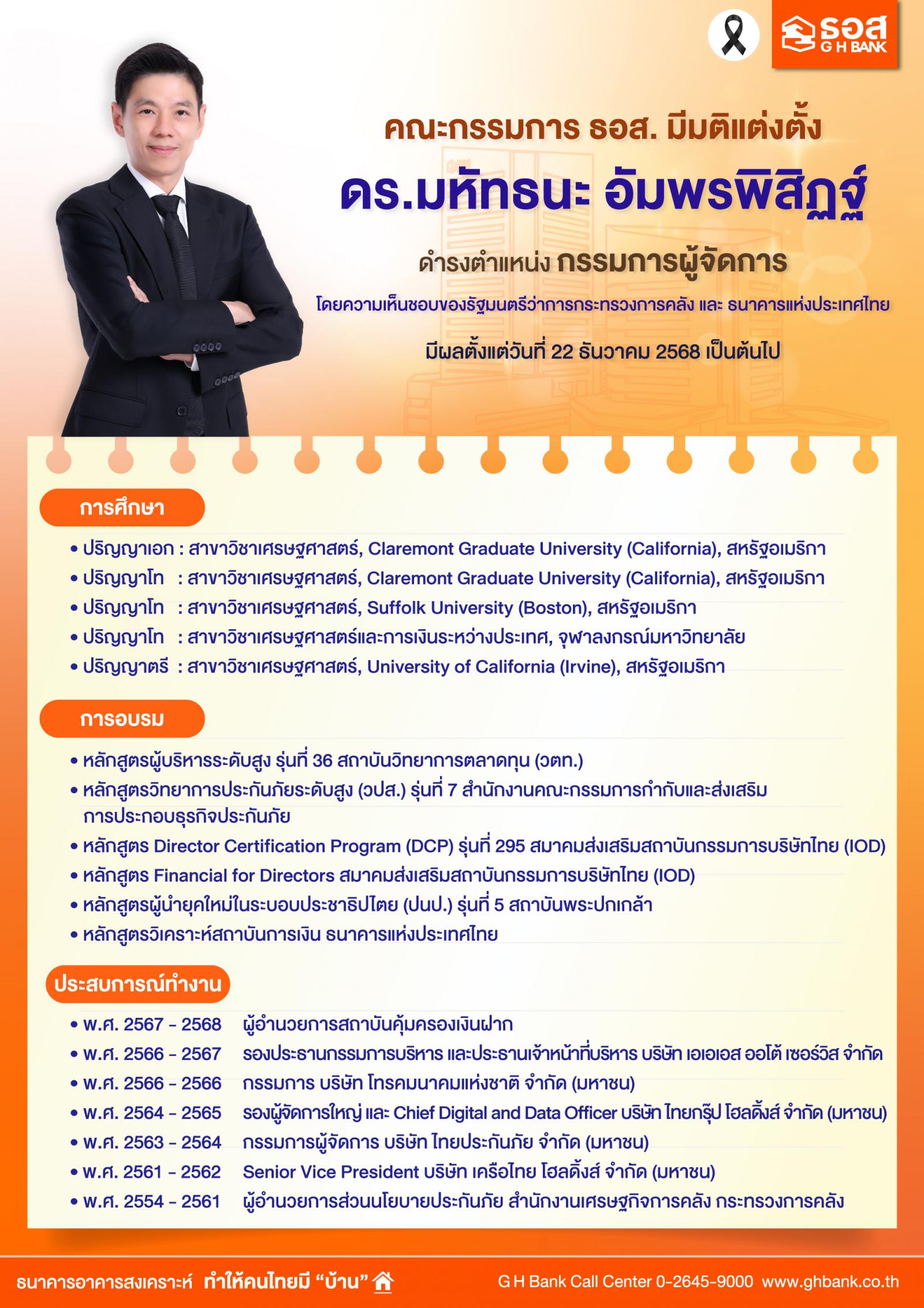 คณะกรรมการธนาคารอาคารสงเคราะห์ (ธอส.) มีมติแต่งตั้ง ดร.มหัทธนะ อัมพรพิสิฏฐ์ ดำรงตำแหน่งกรรมการผู้จัดการธนาคารอาคารสงเคราะห์ โดยความเห็นชอบของรัฐมนตรีว่าการกระทรวงการคลัง และธนาคารแห่งประเทศไทย มีผลตั้งแต่วันที่ 22 ธันวาคม 2568 เป็นต้นไป