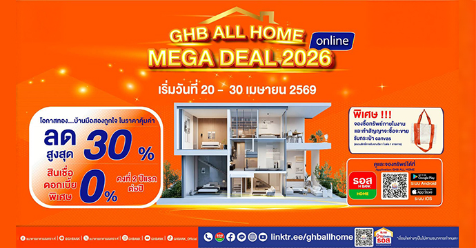 ธนาคารอาคารสงเคราะห์ (ธอส.) สนับสนุนคนไทยมีที่อยู่อาศัยเป็นของตนเองได้ง่ายมากขึ้นในราคาคุ้มค่า จัดงาน “GHB ALL HOME MEGA DEAL 2026 Online” ระหว่างวันนี้ถึงวันที่ 30 เมษายน 2569 ผ่าน Application : GHB ALL HOME โดยนำทรัพย์คุณภาพดีกว่า 1,000 รายการทั่วประเทศ ลดราคาสูงสุดถึง 30% ทั้งบ้านเดี่ยว บ้านแฝด ทาวน์เฮ้าส์ อาคารพาณิชย์ และที่ดินเปล่า พร้อมโปรโมชันสินเชื่ออัตราดอกเบี้ยพิเศษ 0% ต่อปี คงที่ 2 ปีแรก พิเศษ! จองซื้อทรัพย์ภายในงานและทำสัญญาจะซื้อจะขาย รับฟรีกระเป๋าผ้าแคนวาส 1 ใบ (1 ใบต่อ 1 รายการ) ผู้ที่สนใจสามารถดูทรัพย์จริงหรือรับชมภาพทรัพย์ ได้ทาง Application : GHB ALL HOME หรือ www.ghbhomecenter.com สอบถามข้อมูลเพิ่มเติมได้ที่ G H BANK Call Center โทร.0-2645-9000 กด 5 หรือ Facebook Fanpage บ้านมือสอง ธอส. หรือดูข้อมูล บ้านมือสอง ธอส. ได้ที่ www.ghbhomecenter.com, Application : GHB ALL HOME และ Line Official Account : บ้านมือสอง ธอส.