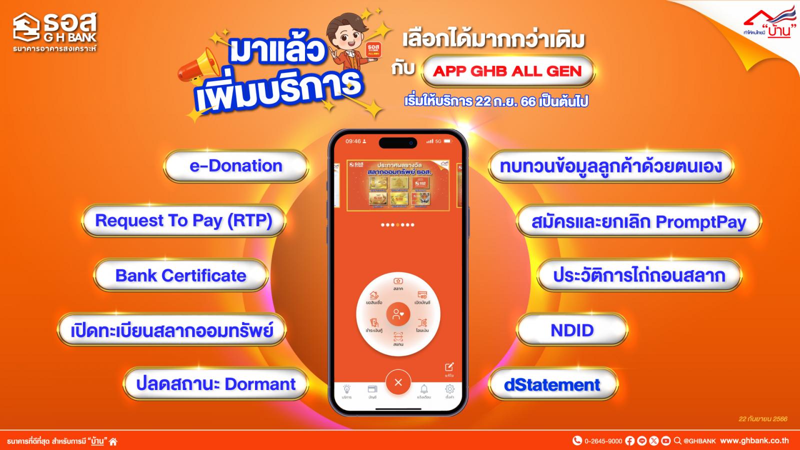ธนาคารอาคารสงเคราะห์ (ธอส.) พัฒนาการให้บริการด้านดิจิทัล เพื่ออำนวยความสะดวกในการใช้บริการของลูกค้ามากยิ่งขึ้น ด้วยการเพิ่มฟังก์ชันการให้บริการผ่าน Application : GHB ALL GEN ในเฟสที่ 3 จำนวน 10 ฟังก์ชัน ประกอบด้วย 1. e-Donation บริการสแกน QR e-Donation หรือเลือกรูปภาพ QR ที่บันทึกไว้ เพื่อโอนเงินบริจาคให้กับสถานศึกษา ศาสนสถาน โรงพยาบาล และองค์กรสาธารณสุขอื่น ๆ 2. Request To Pay (RTP) บริการตั้งเตือนการชำระเงินกู้บนระบบพร้อมเพย์ ไปยังธนาคารต่าง ๆ 3. Bank Certificate บริการขอหนังสือรับรองฐานะทางการเงินผ่านแอปพลิเคชัน เพื่อขอวีซ่าหรือศึกษาต่อต่างประเทศ 4.เปิดทะเบียนสลากออมทรัพย์ สำหรับลูกค้าที่ไม่เคยมีทะเบียนสลากออมทรัพย์ ธอส. มาก่อน 5. ปลดสถานะ (Dormant) บริการปลดสถานะบัญชีที่ไม่เคลื่อนไหว เป็นบัญชีสถานะปกติ (Active) 6. ทบทวนข้อมูลลูกค้าด้วยตนเอง แสดงข้อมูลการแสดงตนก่อนการสร้างความสัมพันธ์หรือทำธุรกรรมกับธนาคาร 7. สมัครและยกเลิก Promptpay เปิดให้บริการสมัครและยกเลิก PromptPay เพื่อให้บริการ รับ-โอนเงินระหว่างธนาคารโดยไม่ต้องใช้เลขที่บัญชีธนาคาร 8. ประวัติการไถ่ถอนสลาก บริการแสดงประวัติรายการไถ่ถอนสลากออมทรัพย์ 9. NDID บริการขอใช้ข้อมูลเพื่อทำธุรกรรมทางการเงินกับธนาคารอื่นด้วยภาพถ่ายใบหน้าในรูปแบบดิจิทัล และ 10. dStatement บริการรับส่งข้อมูลรายการเคลื่อนไหวบัญชีเงินฝาก (Bank Statement) ในรูปแบบดิจิทัลระหว่างสถาบันการเงิน ทั้งนี้ ลูกค้าสามารถสัมผัสบริการใหม่ ๆ ของ ธอส. ได้ตั้งแต่วันที่ 22 กันยายน 2566 เป็นต้นไป สอบถามรายละเอียดเพิ่มเติมได้ที่ธอส. ทุกสาขาทั่วประเทศ G H Bank Call Center โทร 0-2645-9000 หรือ Facebook Fanpage ธนาคารอาคารสงเคราะห์ และติดตามข่าวสารของธนาคาร ได้ที่ Mobile Application : GHB ALL GEN และ www.ghbank.co.th
