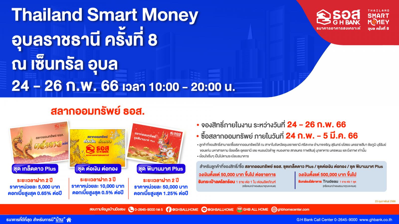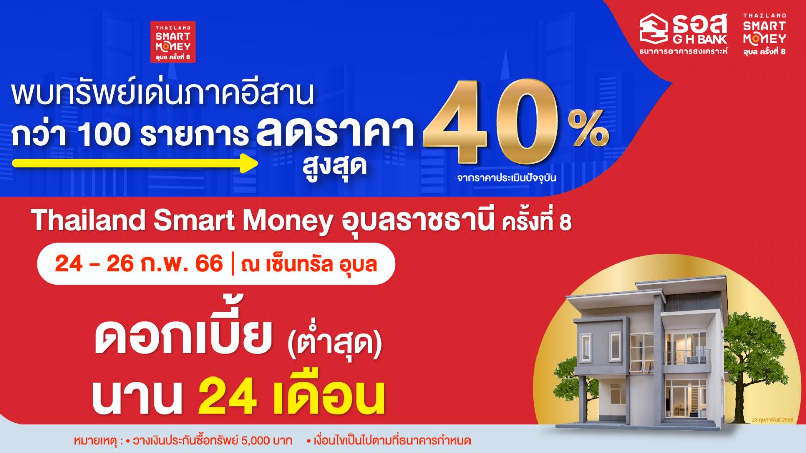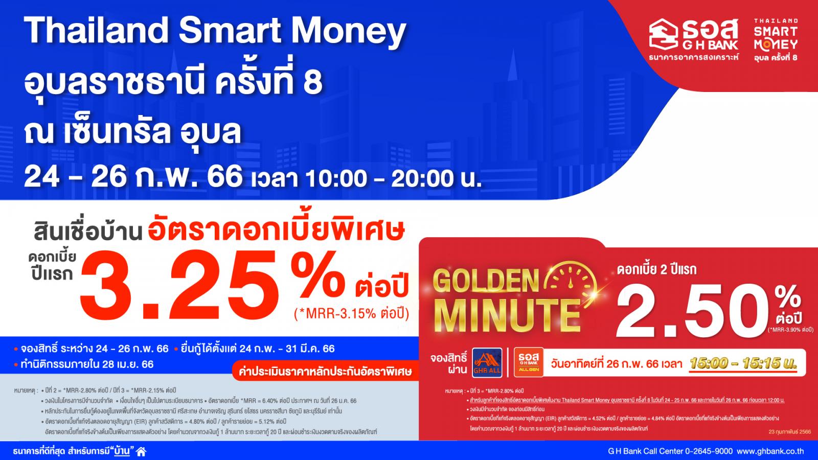 ธนาคารอาคารสงเคราะห์ (ธอส.) จัดโปรโมชั่นเด็ดตะลุยแดนอีสาน ในงาน Thailand Smart Money อุบลราชธานี ครั้งที่ 8 ด้วยการนำผลิตภัณฑ์ทางการเงินของธนาคาร นำโดย สินเชื่อบ้านอัตราดอกเบี้ยต่ำ ปีที่ 1 เท่ากับ MRR-3.15% (ปัจจุบันเท่ากับ 3.25%) ต่อปี เฉลี่ย 3 ปีแรกเพียง 3.70% (อัตราดอกเบี้ย MRR ของ ธอส.ในปัจจุบันเท่ากับ 6.40% ต่อปี) ผ่อนชำระนานสูงสุดถึง 40 ปี ให้กู้ครอบคลุมทุกวัตถุประสงค์หลัก อาทิ ซื้อบ้าน/คอนโดมิเนียม ปลูกสร้าง และรีไฟแนนซ์ หลักประกันในการยื่นคำขอกู้ต้องอยู่ในพื้นที่จังหวัดอุบลราชธานี และพื้นที่ใกล้เคียง จองสิทธิ์ภายในงาน ยื่นกู้ตั้งแต่วันที่ 24 กุมภาพันธ์ - 31มีนาคม 2566 อนุมัติและทำนิติกรรมภายในวันที่ 28 เมษายน 2566 พิเศษ!! ผู้ที่จองสิทธิ์ยังมีโอกาสได้ลุ้นโปรโมชั่นพิเศษกับช่วง Golden Minute อัตราดอกเบี้ยต่ำปีที่ 1 - 2 เพียง MRR-3.90% ต่อปี (ปัจจุบันเท่ากับ 2.50% ต่อปี) ในวันอาทิตย์ที่ 26 กุมภาพันธ์ 2566 เวลา 15.00-15.15 น. (วงเงินมีจำนวนจำกัด)