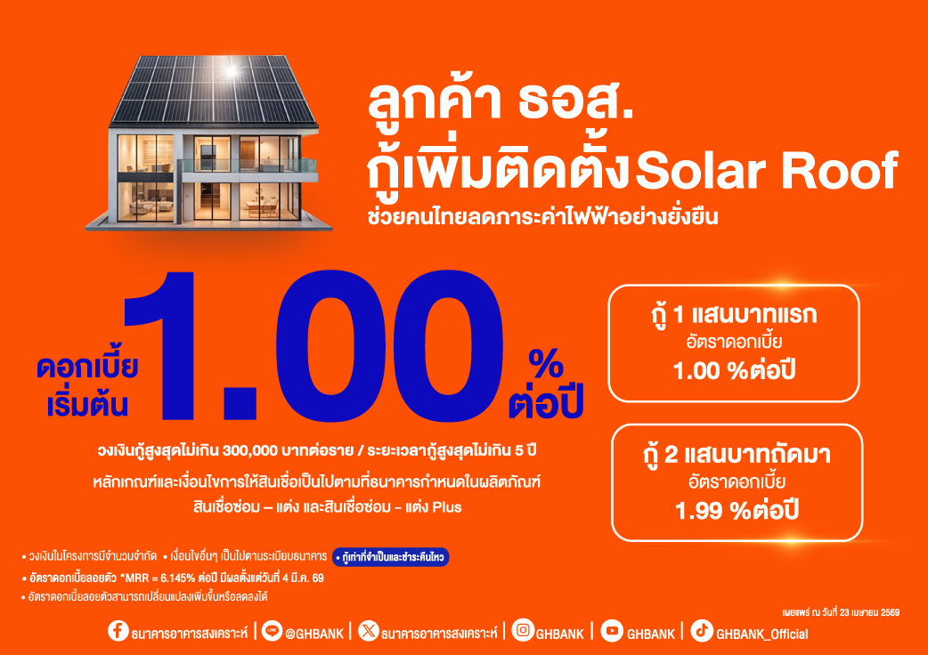 ดร.มหัทธนะ อัมพรพิสิฏฐ์ กรรมการผู้จัดการธนาคารอาคารสงเคราะห์ (ธอส.) เปิดเผยว่า ธอส. เดินหน้าสนับสนุนนโยบายรัฐบาลตามมาตรการให้ความช่วยเหลือผู้ได้รับผลกระทบจากสถานการณ์การสู้รบ ในภูมิภาคตะวันออกกลาง ให้กู้เพิ่มสำหรับลูกค้าปัจจุบันที่ต้องการติดตั้ง Solar Roof หรือปรับปรุงที่อยู่อาศัย เพื่อประหยัดพลังงาน ช่วยลดภาระค่าไฟฟ้าและค่าครองชีพในระยะยาว วงเงินกู้สูงสุดไม่เกิน 300,000 บาทต่อราย โดยวงเงิน 100,000 บาทแรก อัตราดอกเบี้ย 1.00% ต่อปี ผ่อนชำระเงินงวดเพียง 2,900 บาท วงเงิน 200,000 บาทถัดมา อัตราดอกเบี้ย 1.99% ต่อปี ระยะเวลากู้สูงสุดไม่เกิน 5 ปี ผ่อนชำระเงินงวดเริ่มต้นเพียงเดือนละ 3,600 บาท (หลักเกณฑ์และเงื่อนไขการให้สินเชื่อเป็นไปตามที่ธนาคารกำหนดในผลิตภัณฑ์สินเชื่อซ่อม – แต่ง และ สินเชื่อซ่อม - แต่ง Plus)