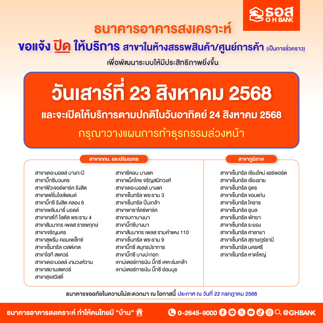 หน้าแรก หน้าแรก ศูนย์ข่าวสาร ข่าวประชาสัมพันธ์ ขอแจ้งการปิดให้บริการชั่วคราวสาขาและเคาน์เตอร์การเงินที่เปิดให้บริการในห้างสรรพสินค้า / ศูนย์การค้าฯ ในวันเสาร์ที่ 23 สิงหาคม 2568 เพื่อปรับปรุงระบบ GHB System ศูนย์ข่าวสาร คัดลอกลิ้งค์เก็บไว้ที่คลิปบอร์ดแล้ว ขอแจ้งการปิดให้บริการชั่วคราวสาขาและเคาน์เตอร์การเงินที่เปิดให้บริการในห้างสรรพสินค้า / ศูนย์การค้าฯ ในวันเสาร์ที่ 23 สิงหาคม 2568 เพื่อปรับปรุงระบบ GHB System ข่าวประชาสัมพันธ์ 23 กรกฎาคม 2568 คัดลอกลิ้งค์เก็บไว้ที่คลิปบอร์ดแล้ว