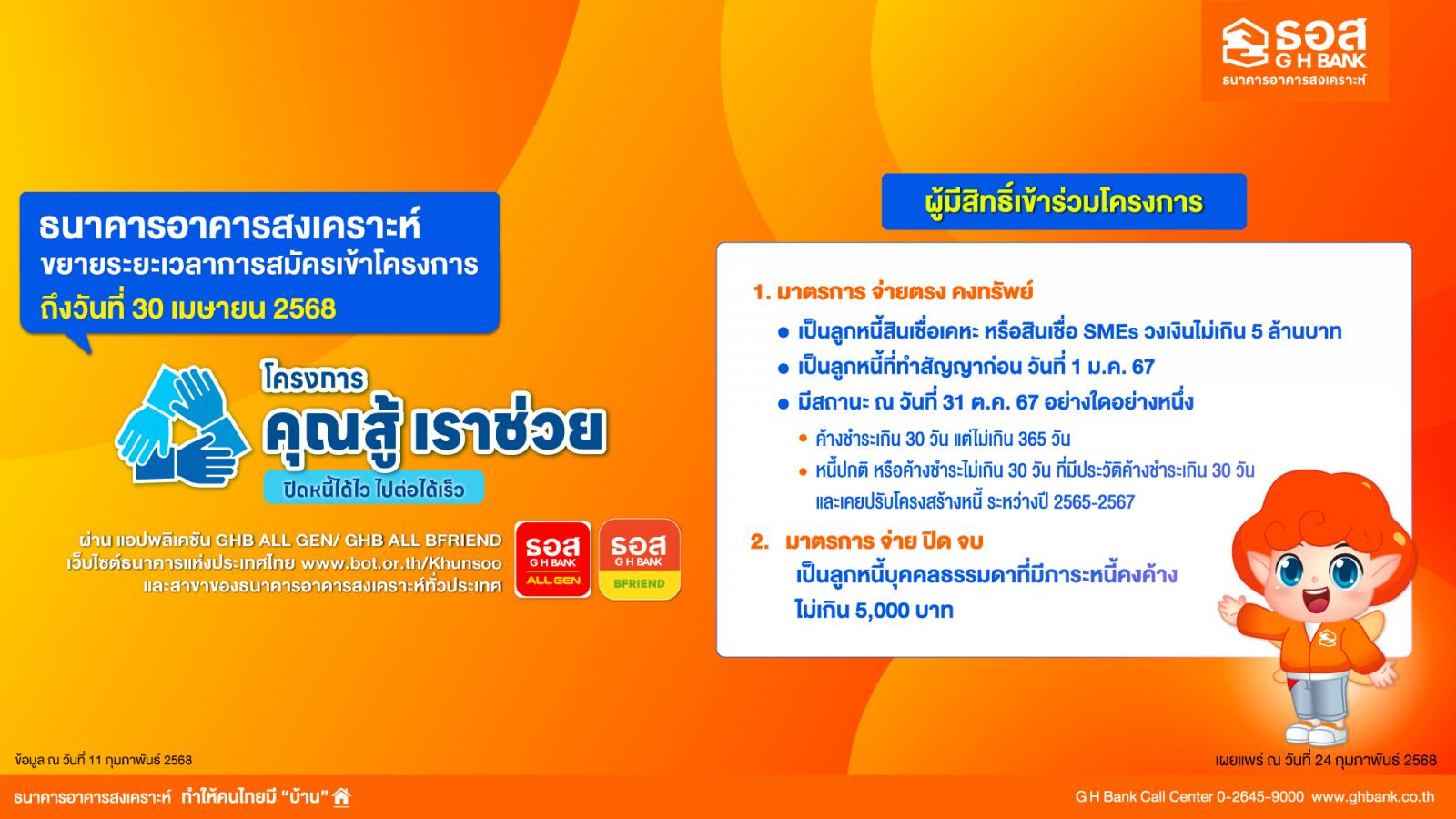 ธนาคารอาคารสงเคราะห์ (ธอส.) ในฐานะสถาบันการเงินของรัฐ สังกัดกระทรวงการคลัง ที่มีพันธกิจ “ทำให้คนไทยมีบ้าน” และสนับสนุนให้คนไทยรักษาบ้านของตนเองไว้ได้ต่อไป พร้อมดำเนินการตามนโยบายของรัฐบาล และธนาคารแห่งประเทศไทย (ธปท.) ขยายระยะเวลาการช่วยเหลือลูกค้าของธนาคารที่ได้รับผลกระทบด้านรายได้และประสบปัญหาการผ่อนชำระเงินงวด สามารถลงทะเบียนเข้าร่วม “โครงการคุณสู้ เราช่วย” ได้ถึงวันที่ 30 เมษายน 2568 ผ่าน 3 ช่องทาง ประกอบด้วย เว็บไซต์ของธนาคารแห่งประเทศไทย www.bot.or.th/Khunsoo หรือ Application : GHB ALL GEN และ Application : GHB ALL BFRIEND สำหรับลูกค้าที่สามารถเข้าร่วมโครงการคุณสู้ เราช่วย จะต้องเป็นผู้ที่มีวงเงินสินเชื่อไม่เกิน 5 ล้านบาท ทำสัญญาก่อนวันที่ 1 มกราคม 2567 และมีสถานะค้างชำระเกิน 30 วัน แต่ไม่เกิน 365 วัน หรือมีสถานะค้างชำระไม่เกิน 30 วัน ที่เคยปรับโครงสร้างหนี้และเคยค้างชำระมากกว่า 30 วัน ระหว่างปี 2565 – 2567 (สถานะดังกล่าวนับ ณ วันที่ 31 ตุลาคม 2567) ผู้ที่เข้าร่วมโครงการคุณสู้ เราช่วย สามารถรับความช่วยเหลือใน 2 มาตรการ ประกอบด้วย “มาตรการจ่ายตรง คงทรัพย์” และ “มาตรการจ่าย ปิด จบ” โดยผู้ที่สนใจเข้าร่วมโครงการสามารถสอบถามรายละเอียดเพิ่มเติมได้ที่ ธอส. ทุกสาขา ทั่วประเทศ หรือ G H Bank Call Center โทร.0-2645-9000 หรือ Facebook Fanpage ธนาคารอาคารสงเคราะห์ และติดตามข่าวสารของธนาคารได้ที่ Application : GHB ALL GEN และ www.ghbank.co.th