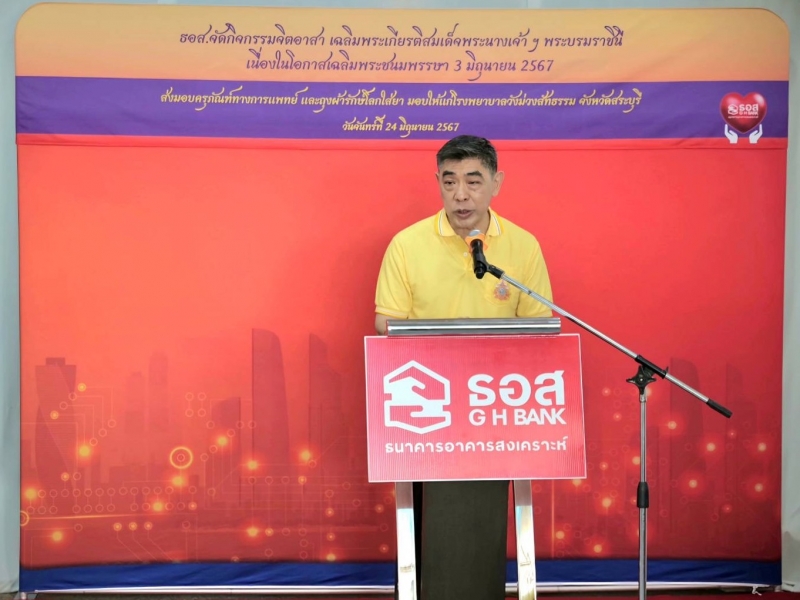 นายกมลภพ วีระพละ กรรมการผู้จัดการ ธนาคารอาคารสงเคราะห์ (ธอส.) เปิดเผยว่า ธอส.ในฐานะสถาบันการเงินของรัฐ สังกัดกระทรวงการคลัง ที่มีพันธกิจ “ทำให้คนไทยมีบ้าน” โดยตลอดระยะเวลากว่า 70 ปี ได้สนับสนุนให้คนไทยมีที่อยู่อาศัยเป็นของตนเองมาแล้วมากกว่า 4.4 ล้านครอบครัว ขณะเดียวกันธนาคารยังได้ดำเนินนโยบายด้านความรับผิดชอบต่อสังคมและสิ่งแวดล้อมควบคู่ไปด้วย ในโอกาสนี้ จึงได้ร่วมเฉลิมพระเกียรติสมเด็จพระนางเจ้าสุทิดา พัชรสุธาพิมลลักษณ พระบรมราชินี เนื่องในโอกาสวันเฉลิมพระชนมพรรษา 3 มิถุนายน 2567 เพื่อแสดงถึงความจงรักภักดีต่อสถาบันพระมหากษัตริย์ โดยดำเนินรอยตามพระราชกรณียกิจ ให้ความช่วยเหลือหน่วยงานด้านการแพทย์และสาธารณสุข โดยมุ่งหวังให้ประชาชนคนไทยมีสุขภาพพลานามัยที่สมบูรณ์แข็งแรง ด้วยการส่งมอบครุภัณฑ์ทางการแพทย์ที่จำเป็นต้องใช้ในการบำบัดรักษาและฟื้นฟูผู้ป่วย ให้แก่โรงพยาบาลวังม่วงสัทธรรม จังหวัดสระบุรี โดยมีนายแพทย์เอกภพ สะเดา ผู้อำนวยการโรงพยาบาลวังม่วงสัทธรรม คณะผู้บริหารโรงพยาบาล ตลอดจนบุคลากรทางการแพทย์โรงพยาบาลวังม่วงสัทธรรม เป็นผู้รับมอบ โดยครุภัณฑ์ทางการแพทย์ ที่ธนาคารส่งมอบนั้น สามารถนำไปใช้ในการบำบัดรักษาและฟื้นฟูผู้ป่วย อาทิ โรคหลอดเลือดสมอง (Stroke) ผู้ป่วยอัมพาต ประกอบด้วย เตียงผู้ป่วยชนิด 3 ไกร์ ปรับด้วยไฟฟ้า ราวปีกนกพร้อมเบาะและเสาน้ำเกลือ จำนวน 2 หลัง, เตียงผู้ป่วยชนิด 3 ไกร์ ราวสไลด์พร้อมเบาะ เสาน้ำเกลือ ตู้ข้างเตียงและถาดคร่อมเตียง จำนวน 2 หลัง, เครื่องกระตุ้นกล้ามเนื้อด้วยไฟฟ้า จำนวน 1 เครื่อง และเครื่องผลิตออกซิเจนขนาด 10 ลิตร จำนวน 1 เครื่อง มูลค่ารวม 400,000 บาท นอกจากนี้ คณะผู้บริหารและผู้ปฏิบัติงานธนาคาร ยังร่วมกิจกรรมจิตอาสาเฉลิมพระเกียรติฯ ประดิษฐ์ถุงผ้ารักษ์โลกสำหรับใส่ยา เบาะรองนั่งผู้สูงอายุและผู้พิการ หมอนช้างบีบบริหารมือสำหรับผู้ป่วยที่ต้องกายภาพบำบัด ให้แก่โรงพยาบาลเพื่อเป็นสาธารณประโยชน์ต่อไปอีกด้วย