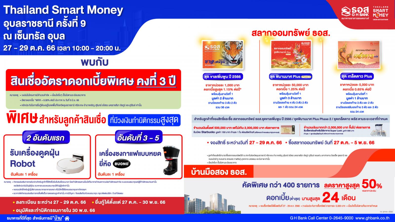 ธนาคารอาคารสงเคราะห์ (ธอส.) จัดโปรโมชันร่วมงาน Thailand Smart Money อุบลราชธานี ครั้งที่ 9 เพื่อส่งเสริมให้ประชาชนชาวภาคตะวันออกเฉียงเหนือ ได้มีที่อยู่อาศัยเป็นของตนเองและเข้าถึงผลิตภัณฑ์ทางการเงินของ ธอส. มากขึ้น นำโดย สินเชื่ออัตราดอกเบี้ยพิเศษ คงที่ 3 ปี ผ่อนชำระเริ่มต้นเพียงเดือนละ 3,600 บาท นานถึง 2 ปีเพื่อซื้อ ปลูกสร้าง ต่อเติม ซ่อมแซม ไถ่ถอนจำนองจากสถาบันการเงินอื่น ชำระหนี้เกี่ยวกับที่อยู่อาศัย สำหรับหลักประกันในการยื่นกู้ต้องอยู่ในเขตพื้นที่ จ.อุบลราชธานี ศรีสะเกษ อำนาจเจริญ สุรินทร์ ยโสธร นครราชสีมา ชัยภูมิ และบุรีรัมย์ ลงทะเบียนภายในงาน ยื่นกู้ อนุมัติและทำนิติกรรมภายในวันที่ 30 พฤศจิกายน 2566 พิเศษ!! ลูกค้าที่มีวงเงินทำนิติกรรมสูงสุด 5 อันดับแรก รับของสมนาคุณฟรีทันที!! โดยอันดับที่ 1-2 รับเครื่องดูดฝุ่น Robot และอันดับที่ 3-5 รับเครื่องชงกาแฟแบบหยด ยี่ห้อ BUONO