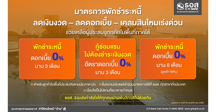 นายกมลภพ วีระพละ กรรมการผู้จัดการธนาคารอาคารสงเคราะห์ (ธอส.) เปิดเผยว่า จากสถานการณ์อุทกภัยที่เกิดขึ้นในพื้นที่อำเภอหาดใหญ่ และพื้นที่ภาคใต้ ส่งผลกระทบต่อบ้านเรือน การดำเนินชีวิต และการประกอบอาชีพของลูกค้าและประชาชนเป็นอย่างมาก ธอส. ในฐานะสถาบันการเงินเฉพาะกิจของรัฐ ที่มีพันธกิจ “ทำให้คนไทยมีบ้าน” ได้จัดเตรียมมาตรการให้ลูกค้าสามารถพักชำระหนี้ ลดเงินงวด ลดดอกเบี้ย และเคลมสินไหมเร่งด่วน เพื่อบรรเทาความเดือดร้อนผู้ที่ได้รับผลลกระทบในพื้นที่ดังกล่าว ผ่าน “มาตรการช่วยเหลือผู้ประสบภัย ปี 2568” โดยมีรายละเอียด ดังนี้