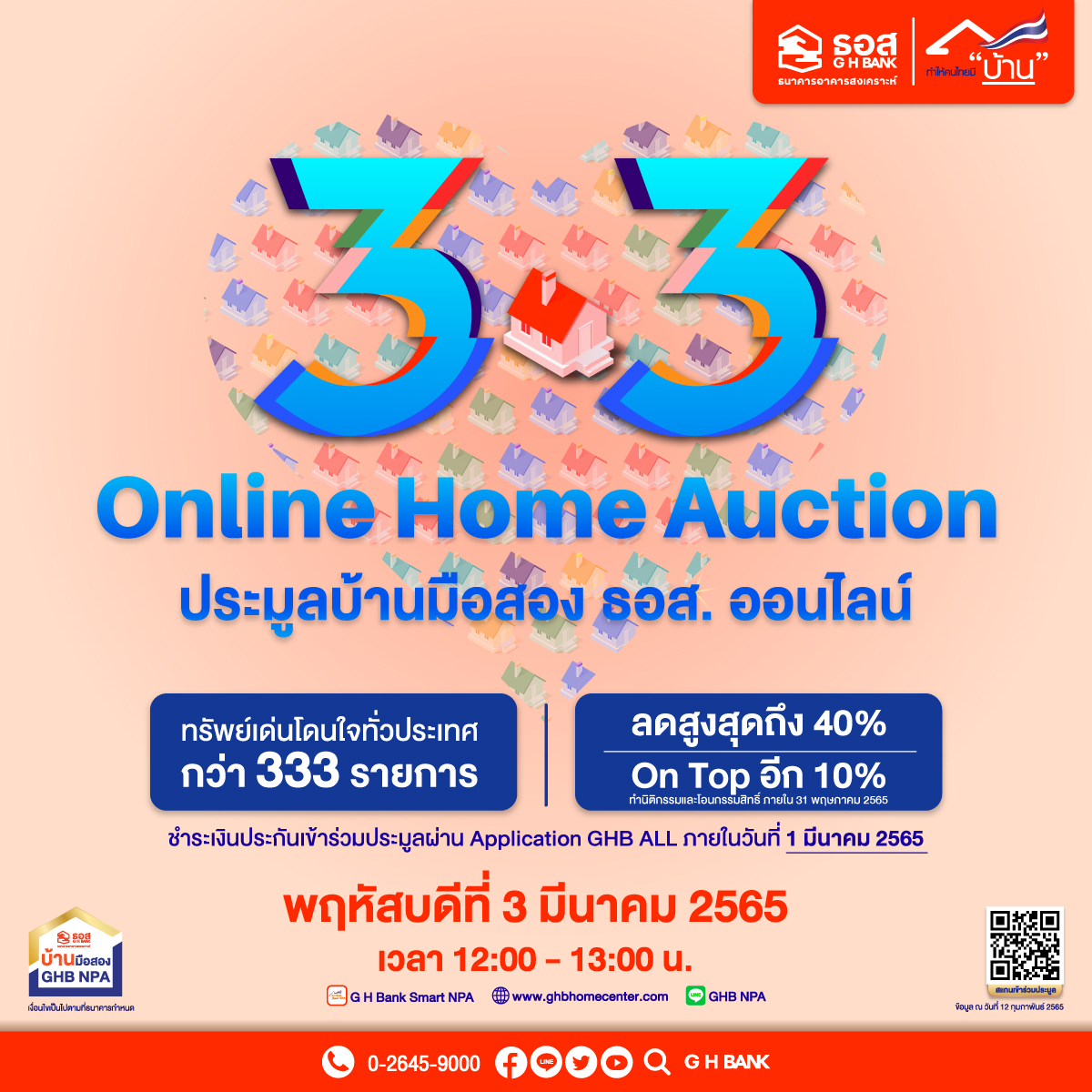 ธนาคารอาคารสงเคราะห์ จัดงาน “3.3 Online Home Auction ประมูลบ้านมือสอง ธอส. ออนไลน์” ผ่าน Application : G H Bank Smart NPA วันพฤหัสบดีที่ 3 มีนาคม 2565 ขนทรัพย์เด่นโดนใจทั่วประเทศ 333 รายการ มาจำหน่ายในราคาพิเศษ พร้อมส่วนลดสูงสุดถึง 40% จากราคาปกติ และโอนกรรมสิทธิ์ภายในวันที่ 31 พฤษภาคม 2565 รับส่วนลด On Top เพิ่มอีก 10% จากราคาที่ปิดประมูล เชื่อประชาชนที่อยากมีบ้านยังให้ความสนใจบ้านมือสอง ธอส. อย่างต่อเนื่อง
