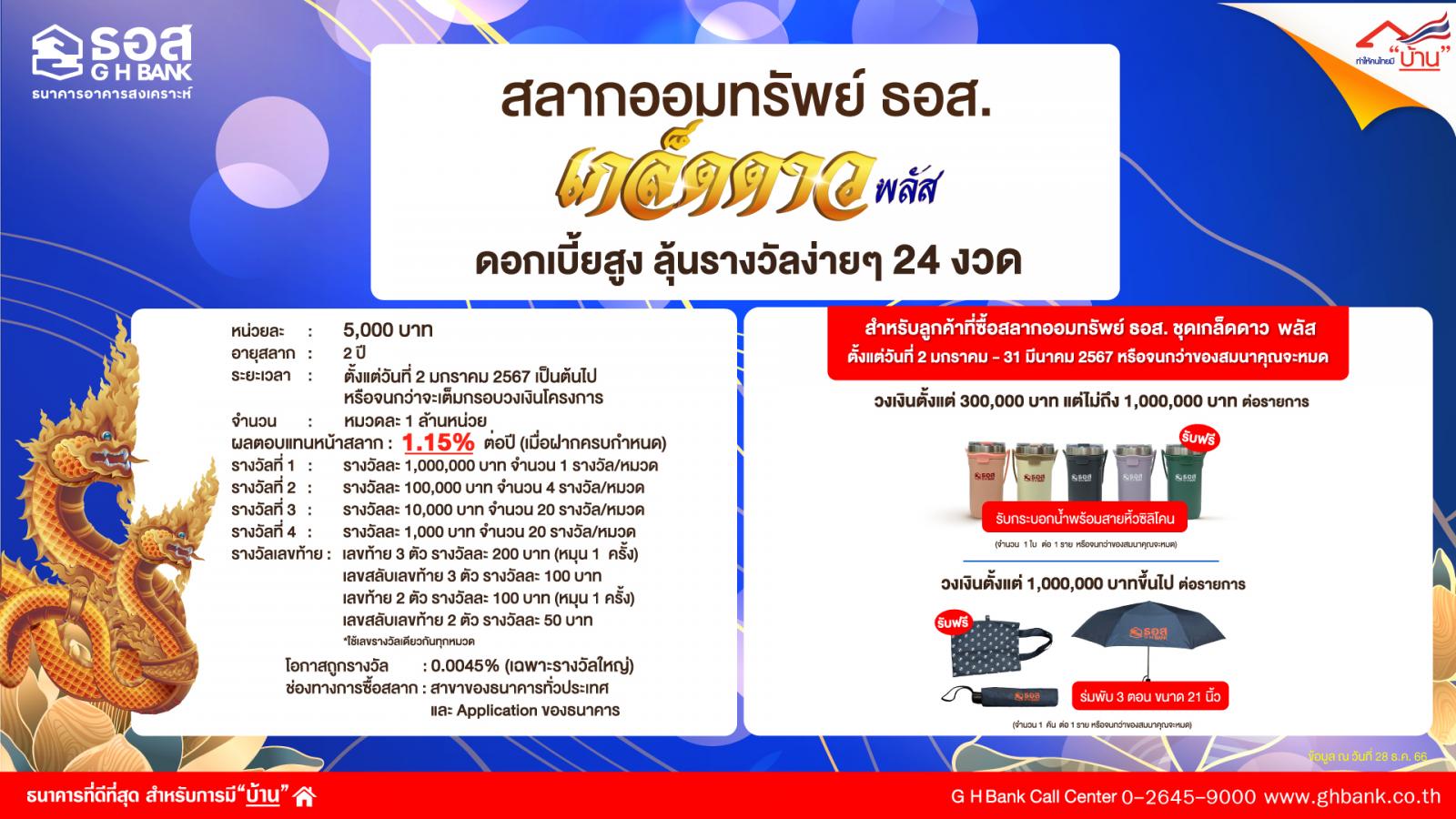 ธนาคารอาคารสงเคราะห์ (ธอส.) มอบโชคต้อนรับปีใหม่ 2567 ให้กับผู้รักการออมที่ต้องการทางเลือกในการออมเงินที่ให้ผลตอบแทนหน้าสลากเพิ่มสูงขึ้น มีโอกาสถูกรางวัลใหญ่ กับ “สลากออมทรัพย์ ชุดเกล็ดดาว พลัส” หน่วยละ 5,000 บาท อายุสลาก 2 ปี ซื้อสลากตั้งแต่วันที่ 2 มกราคม 2567 เป็นต้นไป รับผลตอบแทนหน้าสลากสูงถึง 1.15% ต่อปี เมื่อฝากครบกำหนดจะได้รับเงินต้นพร้อมดอกเบี้ยรวมหน่วยละ 5,115 บาท และมีสิทธิ์ลุ้นรางวัลทุกเดือนรวม 24 ครั้ง โดยรางวัลที่ 1 มูลค่ารางวัลละ 1,000,000 บาท จำนวน 1 รางวัล/หมวด รางวัลที่ 2 รางวัลละ 100,000 บาท จำนวน 4 รางวัล/หมวด รางวัลที่ 3 รางวัลละ 10,000 บาท จำนวน 20 รางวัล/หมวด รางวัลที่ 4 รางวัลละ 1,000 บาท จำนวน 20รางวัล/หมวด คิดเป็นโอกาสในการถูกรางวัลใหญ่สูงถึง 0.0045% โดยรางวัลเลขท้าย 3 ตัว รางวัลละ 200 บาท (หมุน 1 ครั้ง) รางวัลเลขสลับเลขท้าย 3 ตัว รางวัลละ 100 บาท รางวัลเลขท้าย 2 ตัว รางวัลละ 100 บาท (หมุน 1 ครั้ง) รางวัลเลขสลับเลขท้าย 2 ตัว รางวัลละ 50 บาท พร้อมกันนี้ยังสามารถลุ้นรางวัลเลขท้ายและรางวัลเลขสลับเลขท้ายง่ายๆ พิเศษ! ลูกค้าที่ซื้อสลากตั้งแต่วันที่ 2 มกราคม - 31 มีนาคม 2567 วงเงินตั้งแต่ 300,000 บาท แต่ไม่เกิน 1 ล้านบาท/รายการ รับฟรี กระบอกน้ำพร้อมสายหิ้วซิลิโคน จำนวน 1 ใบ/1 ราย และซื้อวงเงินตั้งแต่ 1 ล้านบาท ขึ้นไป/รายการ รับฟรี ร่มพับ 3 ตอน ขนาด 21 นิ้ว จำนวน 1 คัน/1 ราย ผู้ที่สนใจสามารถซื้อสลากออมทรัพย์ ธอส. ผ่าน Application : GHB ALL GEN หรือ ที่สาขาของธนาคาร สอบถามรายละเอียดเพิ่มเติมได้ที่ ธอส.ทุกสาขาทั่วประเทศ GH Bank Call Center โทร 0-2645-9000 หรือ Facebook Fanpage ธนาคารอาคารสงเคราะห์ และติดตามข่าวสารของธนาคารได้ที่ Mobile Application : GHB ALL GEN และ www.ghbank.co.th