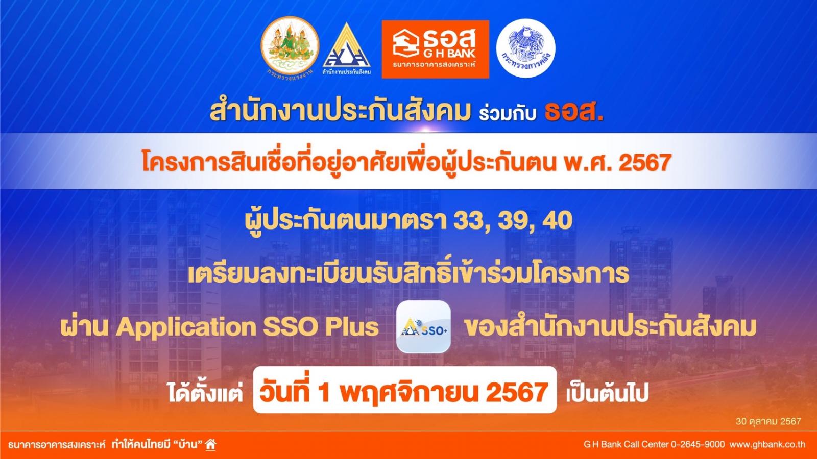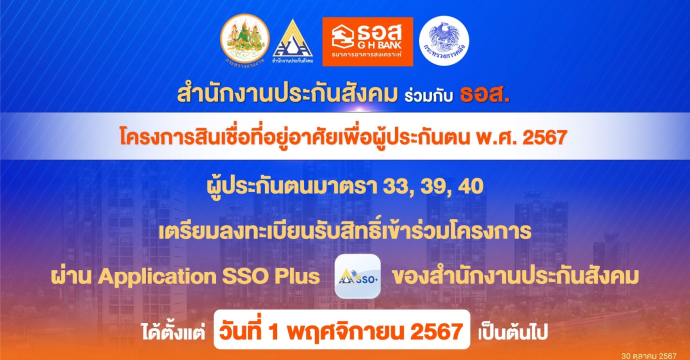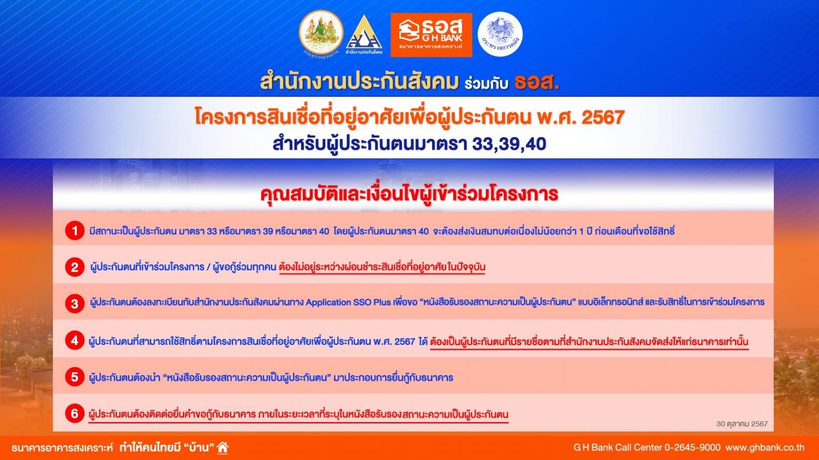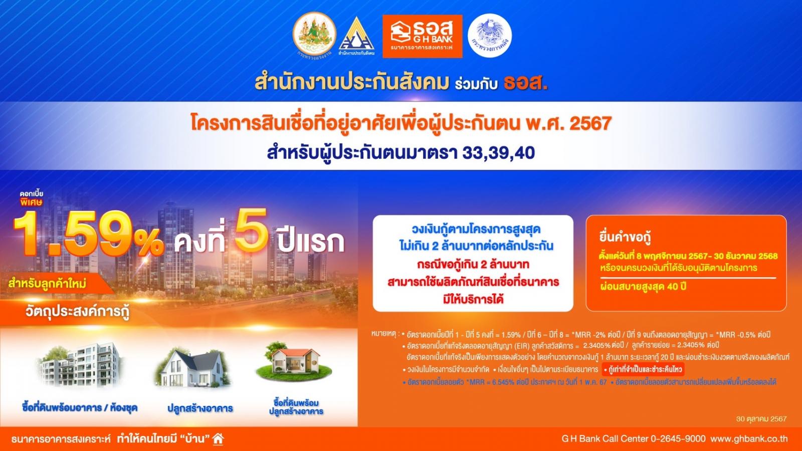 สำนักงานประกันสังคม (สปส.) ร่วมกับธนาคารอาคารสงเคราะห์ (ธอส.) จัดทำ “โครงการสินเชื่อที่อยู่อาศัยเพื่อผู้ประกันตน พ.ศ. 2567” ให้กับผู้ประกันตนตามมาตรา 33, 39 หรือ 40 โดยผู้ประกันตนมาตรา 40 จะต้องส่งเงินสมทบต่อเนื่องไม่น้อยกว่า 1 ปี ก่อนเดือนที่ขอใช้สิทธิ์ โดยปล่อยสินเชื่ออัตราดอกเบี้ยต่ำ 5 ปีแรก เพียง 1.59% ต่อปี วงเงินกู้ตามโครงการสูงสุดไม่เกิน 2 ล้านบาท สำหรับวงเงินกู้ส่วนที่เกิน 2 ล้านบาท สามารถใช้ผลิตภัณฑ์สินเชื่ออื่นของธนาคารได้ ทั้งนี้ ผู้ประกันตนที่เข้าร่วมโครงการ และผู้ขอกู้ร่วมทุกคน ต้องไม่อยู่ระหว่างผ่อนชำระสินเชื่อที่อยู่อาศัยในปัจจุบัน โดยผู้ประกันตนที่สนใจเข้าร่วมโครงการดังกล่าว สามารถลงทะเบียนกับสำนักงานประกันสังคม ผ่านทาง Application SSO Plus เพื่อขอหนังสือรับรองสถานะความเป็นผู้ประกันตน และรับสิทธิ์เข้าร่วมโครงการ ได้ตั้งแต่วันที่ 1 พฤศจิกายน 2567 เป็นต้นไป พร้อมนำเอกสารส่วนตัว เอกสารแสดงรายได้ และเอกสารหลักประกัน มายื่นขอสินเชื่อได้ที่ ธอส. ทุกสาขาทั่วประเทศ ได้ตั้งแต่วันที่ 8 พฤศจิกายน 2567 เป็นต้นไป โดยผู้ประกันตนจะต้องติดต่อยื่นคำขอกู้กับ ธอส. ภายในระยะเวลาที่ระบุในหนังสือรับรองสถานะความเป็นผู้ประกันตน โดยสอบถามรายละเอียดเพิ่มเติมได้ที่ G H Bank Call Center โทร 0-2645-9000 หรือ Facebook Fanpage ธนาคารอาคารสงเคราะห์ และติดตามข่าวสารของธนาคารได้ที่ Application : GHB ALL GEN และ www.ghbank.co.th