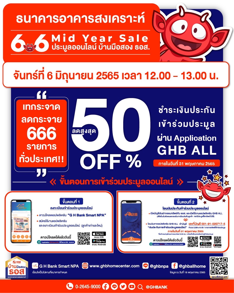 ธนาคารอาคารสงเคราะห์ จัดงาน “6.6 Mid Year Sale ประมูลบ้านมือสอง ธอส. ออนไลน์” ผ่าน Application : GH Bank Smart NPA วันจันทร์ที่ 6 มิถุนายน 2565 ขนทรัพย์เด่นราคาโดนใจทั่วประเทศกว่า 666 รายการ มาจำหน่ายพร้อมส่วนลดพิเศษสูงสุดถึง 50% จากราคาปกติ รับสินเชื่อบ้านมือสอง ดอกเบี้ย 0% นานสูงสุด 24 เดือน เริ่มประมูลพร้อมกันทุกรายการในวันจันทร์ที่ 6 มิถุนายน 2565 ระหว่างเวลา 12.00-13.00 น.