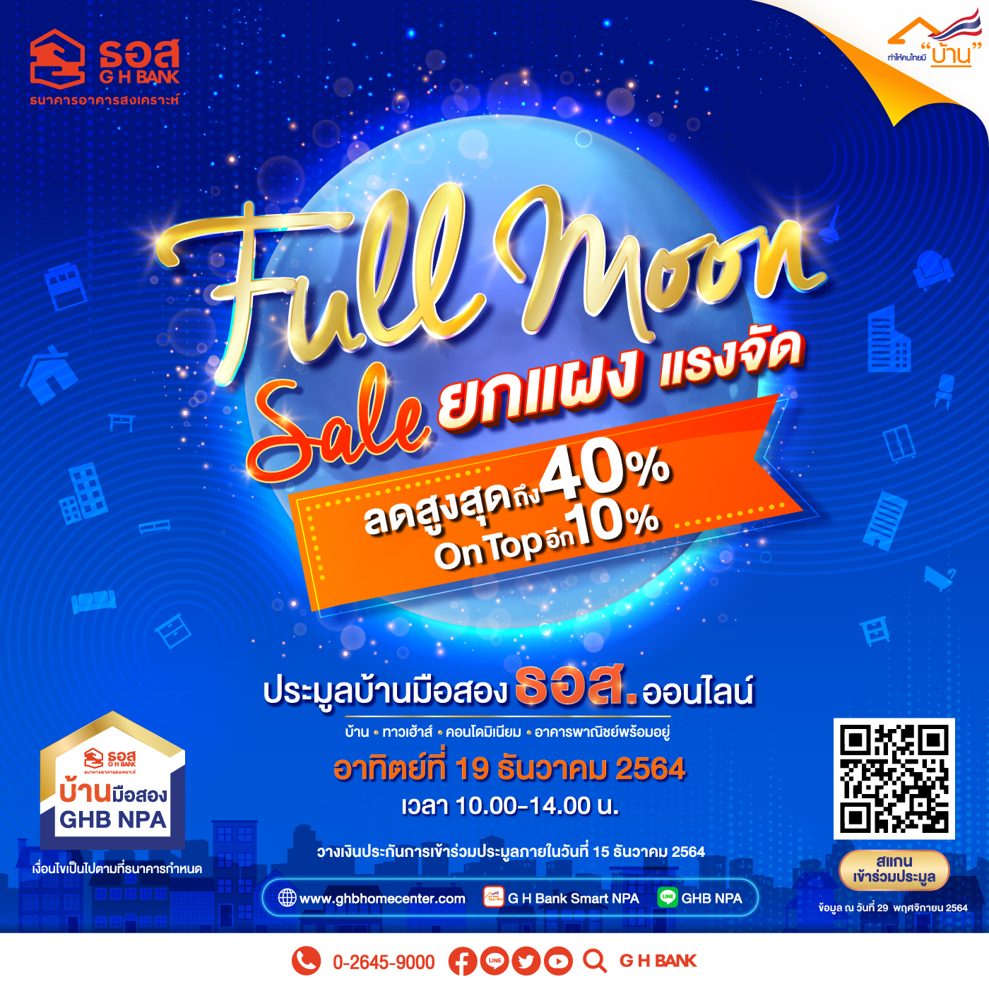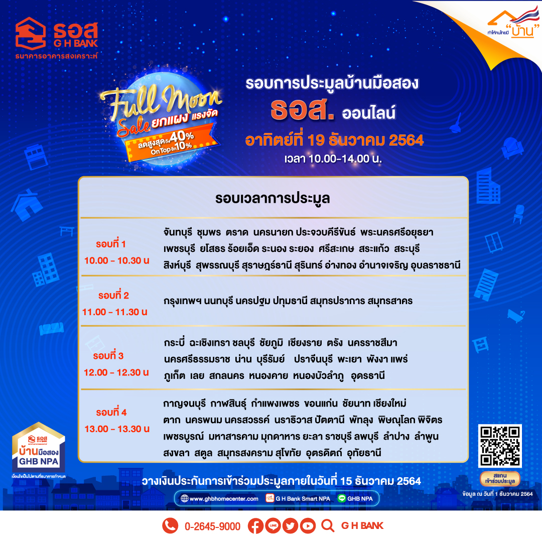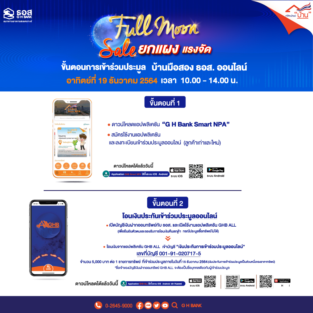 ธนาคารอาคารสงเคราะห์(ธอส.) ลดราคายกแผง แรงจัดส่งท้ายปี 2564 เอาใจคนอยากมีบ้าน ในงาน “ประมูลบ้านมือสอง ธอส. ออนไลน์ (Full Moon Full Sale)” ในวันอาทิตย์ที่ 19 ธันวาคม 2564 ด้วยระบบออนไลน์ ผ่าน Mobile Application : G H Bank Smart NPA นำทรัพย์ทั่วประเทศออกประมูล 3,708 รายการ ทั้งบ้านเดี่ยว บ้านแฝด ทาวน์เฮ้าส์ ห้องชุด แฟลต อาคารพาณิชย์ และที่ดินเปล่า แบ่งเป็นทรัพย์ในพื้นที่กรุงเทพฯ และปริมณฑล จำนวน 1,018 รายการ และทรัพย์ในภูมิภาค จำนวน 2,690 รายการ ราคาเริ่มต้นประมูลลดสูงสุดถึง 40% จากราคาปกติ ราคาเริ่มต้นประมูลต่ำสุดเพียง 50,000 บาท เท่านั้น พิเศษ!! ผู้ชนะประมูลทรัพย์สามารถใช้มาตรการผ่อนดาวน์ดอกเบี้ย 0% นานสูงสุดถึง 48 เดือน พร้อมรับส่วนลดเพิ่มอีก 10% หากทำนิติกรรมภายในวันที่ 28 กุมภาพันธ์ 2565