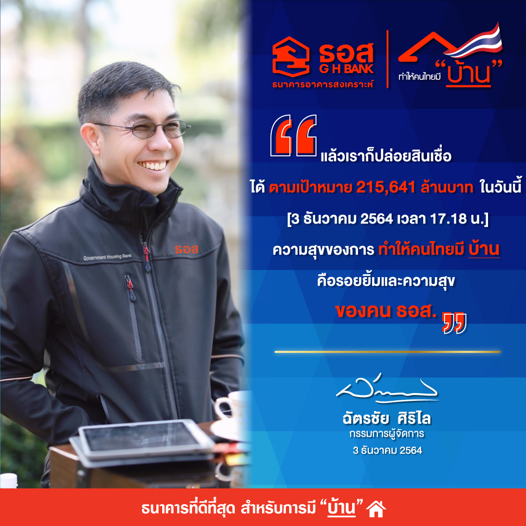 นายฉัตรชัย ศิริไล กรรมการผู้จัดการ ธนาคารอาคารสงเคราะห์(ธอส.) เปิดเผยว่า เมื่อวันศุกร์ที่ 3 ธันวาคม 2564 เวลา 17.18 น. ธอส. สามารถปล่อยสินเชื่อใหม่ได้จำนวน 215,701 ล้านบาท สูงกว่าเป้าหมายในปี 2564 ซึ่งตั้งไว้ที่ 215,641 ล้านบาทเรียบร้อยแล้ว แม้จะเกิดสถานการณ์แพร่ระบาดของไวรัส COVID -19 ตั้งแต่ช่วงต้นปี 2563 จนถึงปัจจุบัน แต่ ธอส. ในฐานะสถาบันการเงินเฉพาะกิจของรัฐที่มีพันธกิจ “ทำให้คนไทยมีบ้าน” ยังคงสามารถสนับสนุนนโยบายของรัฐบาล และกระทรวงการคลัง ในการช่วยเหลือประชาชน โดยเฉพาะผู้มีรายได้น้อยถึงปานกลางให้มีที่อยู่อาศัยเป็นของตนเอง เพื่อความสุขของคนไทย เพื่อการยกระดับคุณภาพชีวิต และความมั่นคงในด้านที่อยู่อาศัย