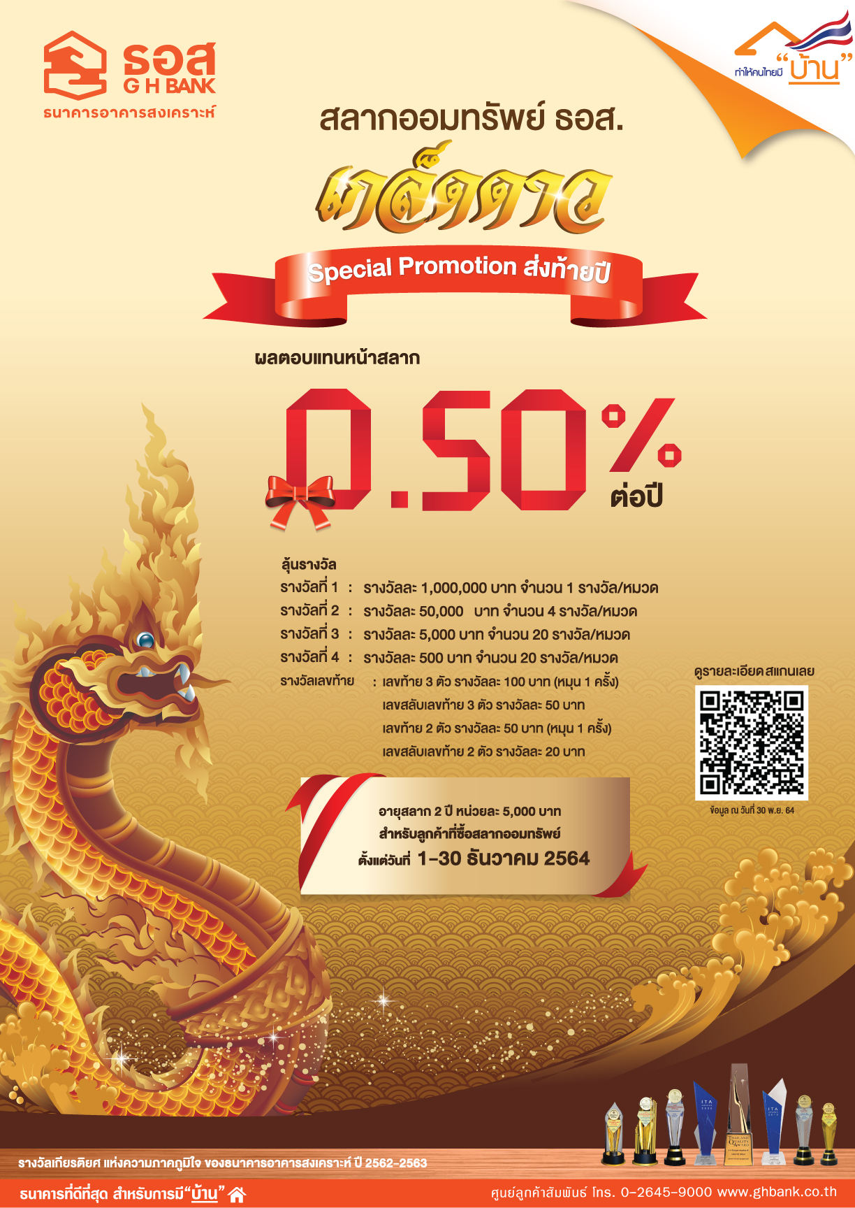 ธนาคารอาคารสงเคราะห์ (ธอส.) เปิดสลากออมทรัพย์ ธอส. พรีเมียม ส่งท้ายปีเก่าต้อนรับปีใหม่ 2565 ด้วยสลากออมทรัพย์พรีเมียม ชุดพราวพิมาน Plus หน่วยละ 10 ล้านบาท อายุสลาก 2 ปี ผลตอบแทนหน้าสลากสูง 0.80% ต่อปี ลุ้นรางวัลที่ 1 มูลค่า 1 ล้านบาท ทุกเดือน โอกาสถูกรางวัลสูงสุดในตลาดถึง 1.30% ฝากครบกำหนดได้รับเงินต้นและดอกเบี้ยรวมหน่วยละ 10,160,000 บาท เปิดขายจำนวนจำกัดแค่ 1,000 หน่วย เริ่มจำหน่ายตั้งแต่วันที่ 2 ธันวาคม 2564 เป็นต้นไป ออกรางวัลครั้งแรกวันที่ 16 ธันวาคม 2564 พิเศษ!! ซื้อตั้งแต่วันที่ 2 ธันวาคม 2564 – วันที่ 31 มกราคม 2565 รับ บัตรกำนัล Starbuck มูลค่า 300 บาท จำนวน 1 ใบ ต่อ 1 ราย และพิเศษสุด!! สำหรับผู้ซื้อสลากออมทรัพย์ ธอส. ชุดเกล็ดดาว หน่วยละ 5,000 บาท ตั้งแต่วันที่ 1-30 ธันวาคม 2564 รับผลตอบแทนหน้าสลากเพิ่มขึ้นเป็น 0.50% ต่อปี จากเดิม 0.40% ต่อปี พร้อมได้ลุ้นรางวัลมากมาย
