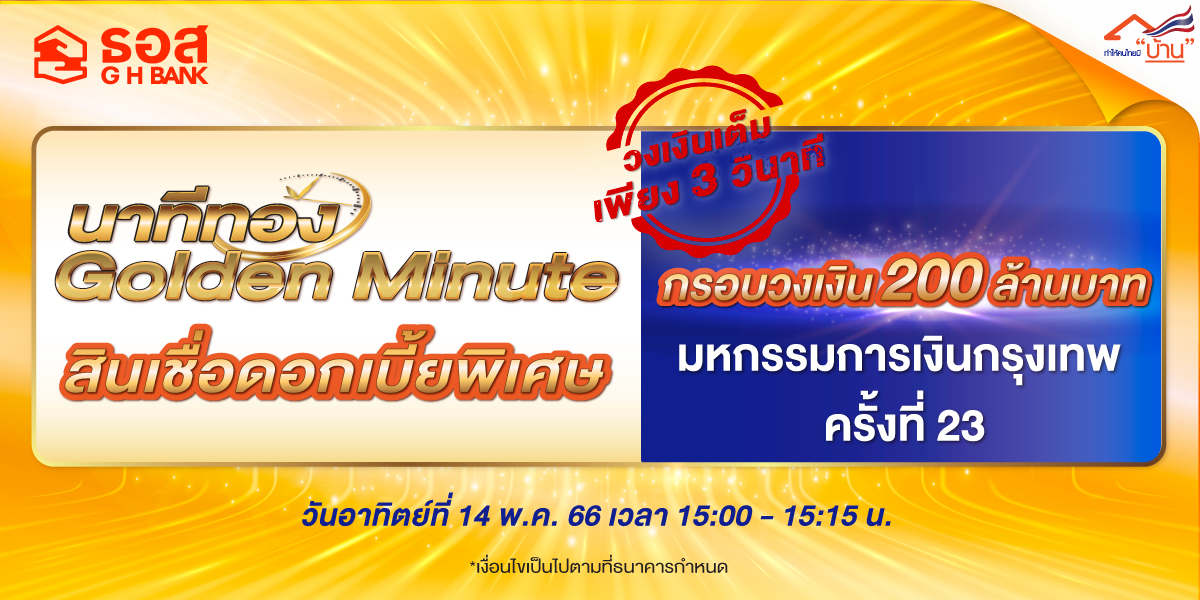 ธนาคารอาคารสงเคราะห์ (ธอส.) จัดโปรโมชั่นพิเศษสำหรับผู้ที่ต้องการมีที่อยู่อาศัยเป็นของตนเองให้ได้รับ อัตราดอกเบี้ยต่ำพิเศษในงาน “มหกรรมการเงินกรุงเทพฯ ครั้งที่ 23 Money Expo Bangkok 2023” กับช่วง “Golden Minute” สินเชื่อบ้านอัตราดอกเบี้ย 2 ปีแรก 2.75% ต่อปี โดยจองสิทธิ์ผ่าน Mobile Application : GHB ALL และ GHB ALL GEN ในวันอาทิตย์ที่ 14 พฤษภาคม 2566 เวลา 15.00 น. ผลปรากฏว่า มีลูกค้าจองสิทธิ์กันเป็นจำนวนมาก ทำให้เต็มกรอบวงเงิน 200 ล้านบาท ภายในระยะเวลาเพียง 3 วินาที เท่านั้น!! ทั้งนี้ผู้ที่จองสิทธิ์สามารถ ยื่นคำขอกู้ภายในวันที่ 15 มิถุนายน 2566 และทำนิติกรรมภายในวันที่ 31 กรกฎาคม 2566 สอบถามรายละเอียด เพิ่มเติมได้ที่ ธอส.ทุกสาขาทั่วประเทศ G H Bank Call Center โทร 0-2645-9000 หรือ Facebook Fanpage ธนาคารอาคารสงเคราะห์ และติดตามข่าวสารของธนาคาร ได้ที่ Mobile Application : GHB ALL GEN และ www.ghbank.co.th