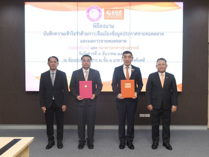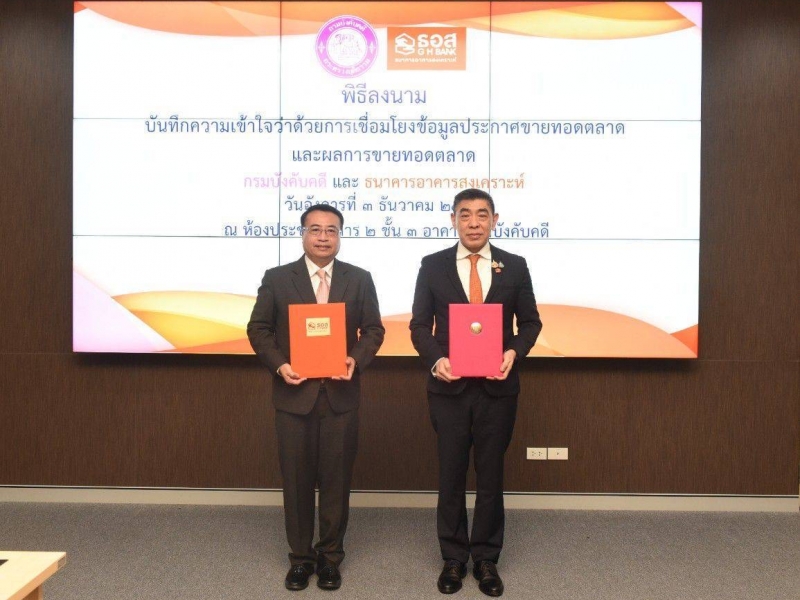นายกมลภพ วีระพละ กรรมการผู้จัดการ ธนาคารอาคารสงเคราะห์ (ธอส.) และ นายเสกสรร สุขแสง อธิบดีกรมบังคับคดี ร่วมลงนามบันทึกความเข้าใจว่าด้วยการเชื่อมโยงข้อมูลประกาศขายทอดตลาด และผลการขายทอดตลาด เพื่อเป็นการประสานความร่วมมือทางด้านการบังคับคดี รวมทั้งเชื่อมโยงข้อมูลทรัพย์ที่จะประกาศขายทอดตลาด และผลการขายทอดตลาดระหว่างกรมบังคับคดีกับ ธอส. ผ่านระบบเทคโนโลยีสารสนเทศ โดยธนาคารสามารถติดตามข้อมูลทรัพย์ที่กรมบังคับคดีประชาสัมพันธ์ประกาศขายทอดตลาด และผลการขายทอดตลาดในแต่ละคดีหรือแต่ละนัดที่กรมบังคับคดีดำเนินการได้อย่างรวดเร็วและทันที (Real Time) ซึ่งจะทำให้กระบวนการบังคับคดีเป็นไปอย่างรวดเร็วและมีประสิทธิภาพมากยิ่งขึ้น โดยพิธีลงนามบันทึก ความเข้าใจว่าด้วยการเชื่อมโยงข้อมูลประกาศขายทอดตลาดและผลการขายทอดตลาด จัดขึ้น ณ ห้องประชุมคชสาร 2 ชั้น 3 อาคารกรมบังคับคดี กรมบังคับคดี ถนนบางขุนนนท์ เขตบางกอกน้อย กรุงเทพมหานคร เมื่อวันที่ 3 ธันวาคม 2567