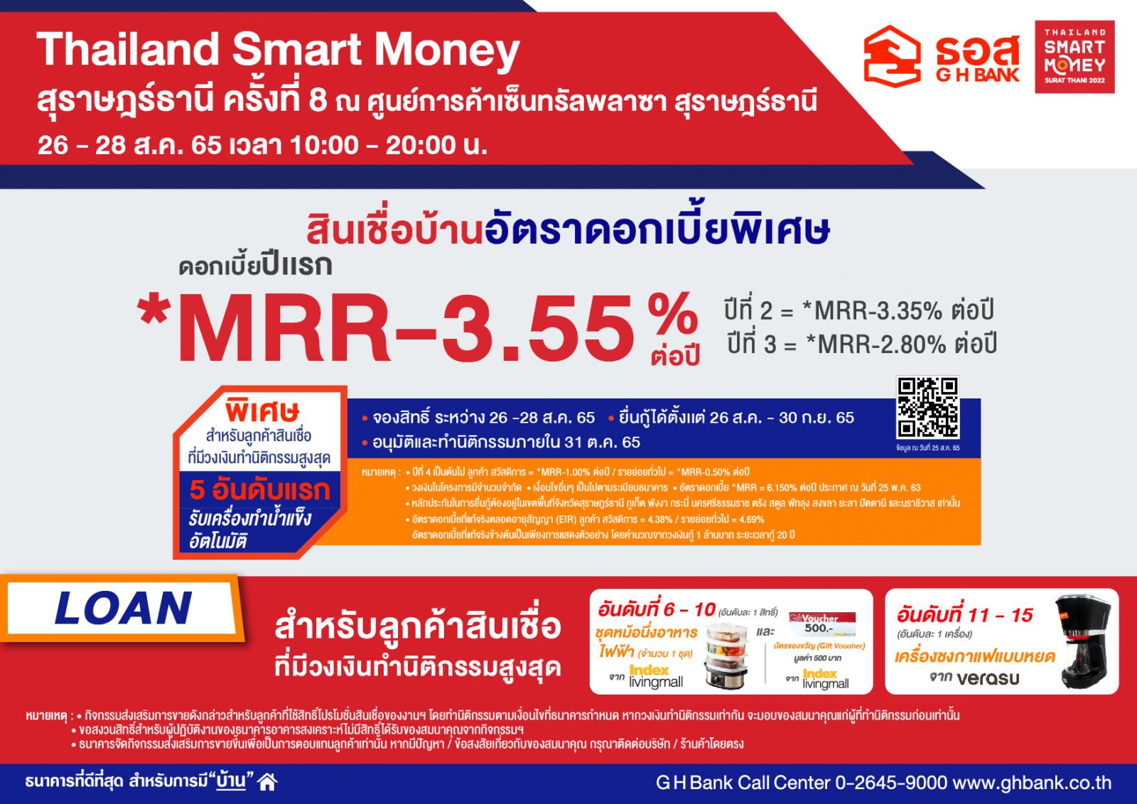 1.สินเชื่อบ้านอัตราดอกเบี้ยพิเศษ ปีที่ 1 เท่ากับ MRR-3.55% ต่อปี (ปัจจุบันเท่ากับ 2.60%) อัตราดอกเบี้ยเฉลี่ย 3 ปีแรกเพียง 2.917% (อัตราดอกเบี้ย MRR ธอส. ปัจจุบันเท่ากับ 6.150% ต่อปี) ผ่อนชำระนานสูงสุดถึง 40 ปี ให้กู้ครอบคลุมวัตถุประสงค์การกู้หลัก อาทิ ซื้อ ปลูกสร้าง ต่อเติม ซ่อมแซม ไถ่ถอนจำนองจากสถาบันการเงินอื่น (รีไฟแนนซ์) สำหรับที่อยู่อาศัยที่นำมาเป็นหลักประกันการกู้ในจังหวัดสุราษฎร์ธานี ภูเก็ต พังงา กระบี่ นครศรีธรรมราช ตรัง สตูล พัทลุง สงขลา ยะลา ปัตตานี และนราธิวาส จองสิทธิ์ภายในงานระหว่างวันที่ 26-28 สิงหาคม 2565 ยื่นคำขอกู้ตั้งแต่วันที่ 26 สิงหาคม -30 กันยายน 2565 อนุมัติและทำนิติกรรมภายในวันที่ 31 ตุลาคม 2565 ลูกค้าสินเชื่อที่ทำนิติกรรมภายในเวลาที่ธนาคารกำหนดและมีวงเงินทำนิติกรรมสูงสุด 15 อันดับแรก รับของสมนาคุณฟรี!! อาทิ เครื่องทำน้ำแข็งอัตโนมัติ ชุดหม้อนึ่งอาหารไฟฟ้า Gift Voucher มูลค่า 500 บาท จาก Index Living Mall และเครื่องชงกาแฟแบบหยด จาก Verasu