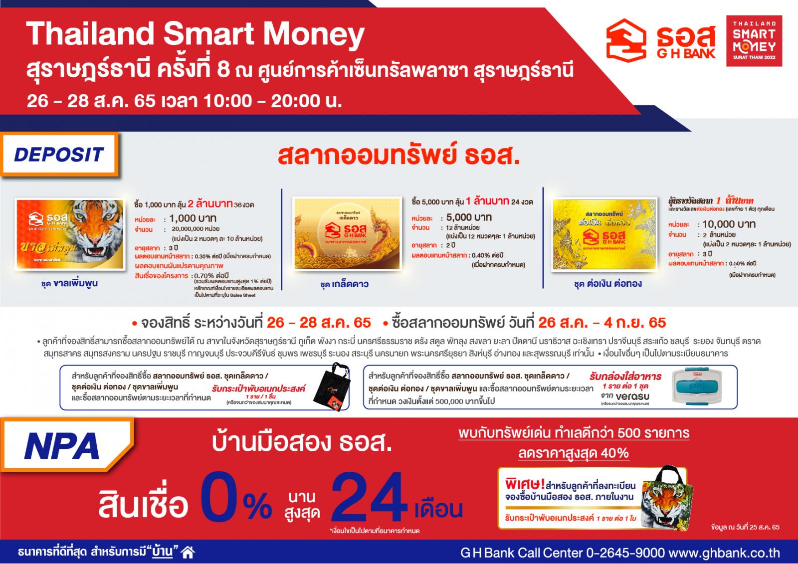 ทั้งนี้ ลูกค้าที่สนใจผลิตภัณฑ์ของธนาคารสามารถจองสิทธิ์ใช้บริการและขอรับคำปรึกษาจากเจ้าหน้าที่ของ ธอส.ได้ที่งาน “Thailand Smart Money สุราษฎร์ธานี ครั้งที่ 8” ระหว่างวันที่ 26-28 สิงหาคม 2565 ณ ศูนย์การค้าเซ็นทรัลพลาซา สุราษฎร์ธานี สอบถามรายละเอียดเพิ่มเติมได้ที่ ธอส.ทุกสาขาทั่วประเทศ G H Bank Call Center โทร 0-2645-9000 หรือ Facebook Fanpage ธนาคารอาคารสงเคราะห์ และติดตามข่าวสารของธนาคารได้ที่ Mobile Application : GHB ALL และ www.ghbank.co.th